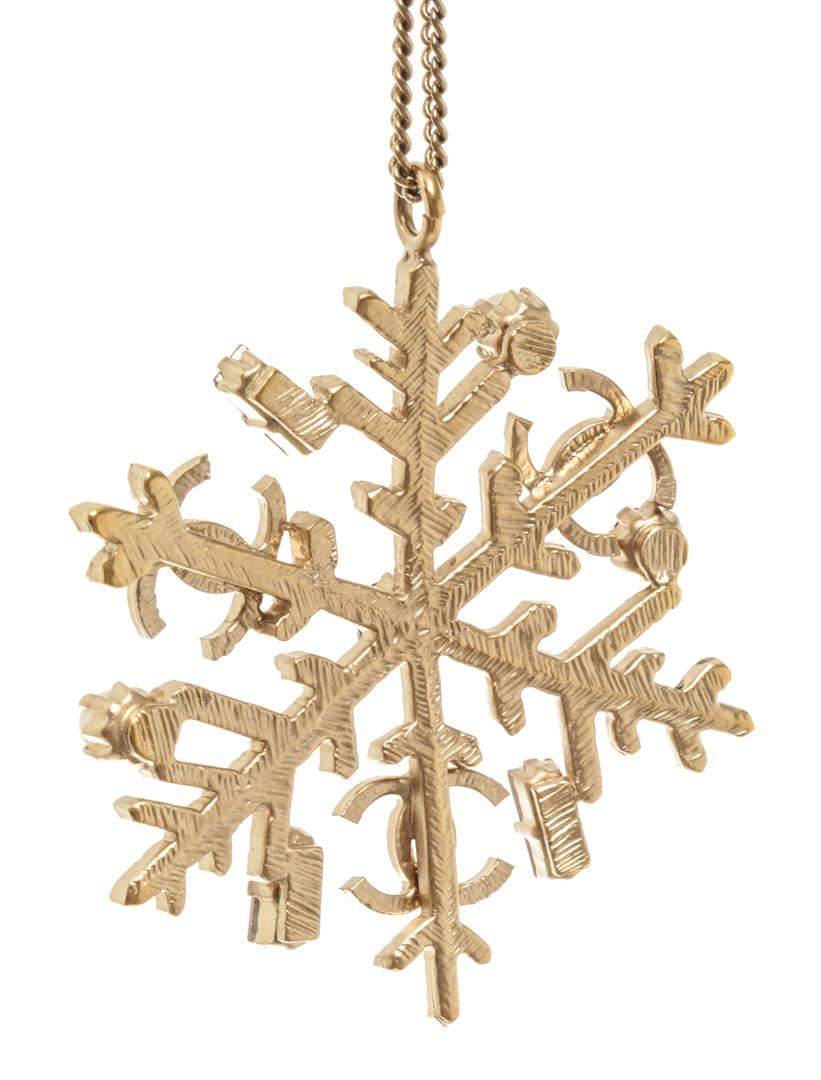 Chanel Gold CC Snowflake Necklace. All available information is listed in the description and shown in the photos. Chanel gold CC snowflake necklace with gold-tone hardware, spring ring closure with two-length options, snowflake pendant with faux pearls, rhinestones, stones, and the CC logos.