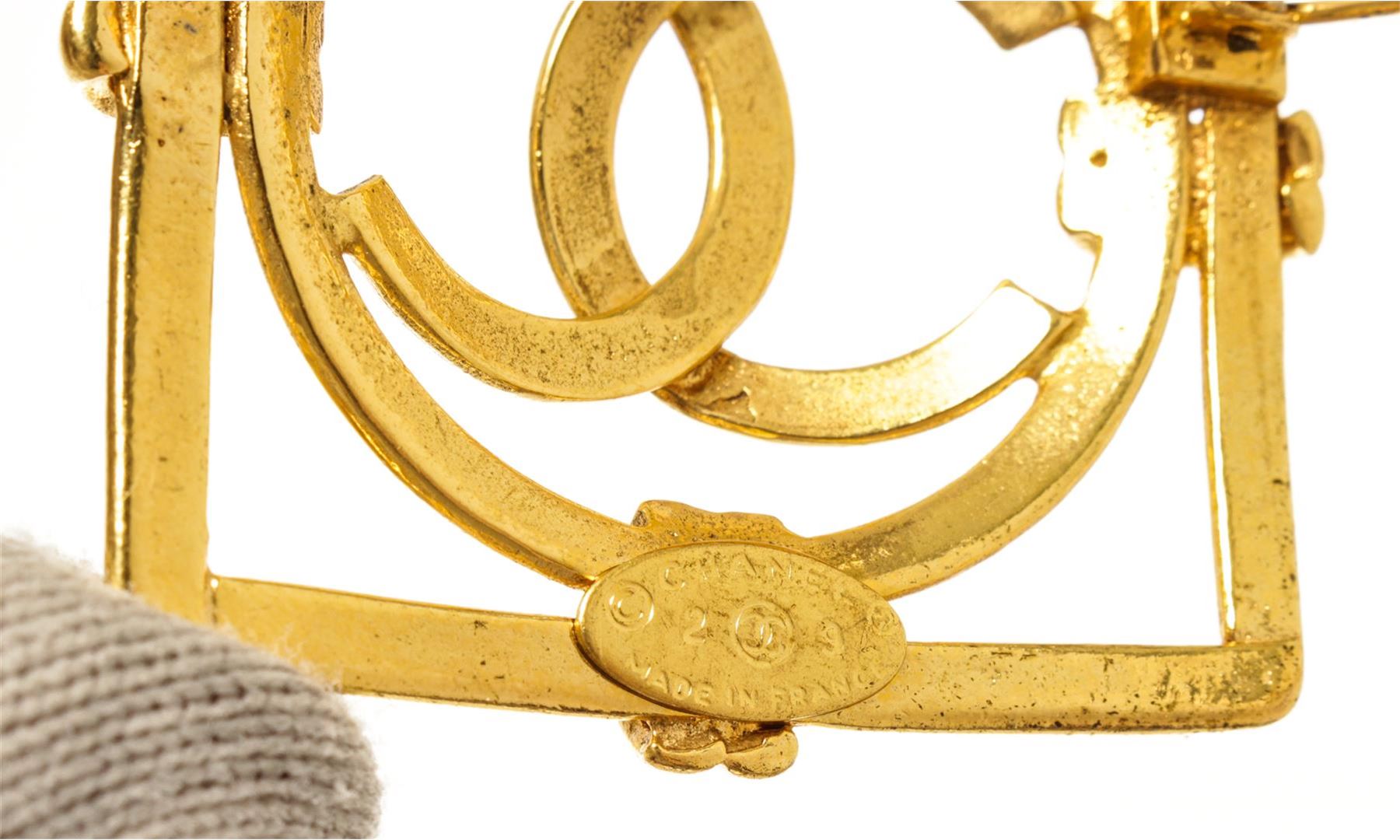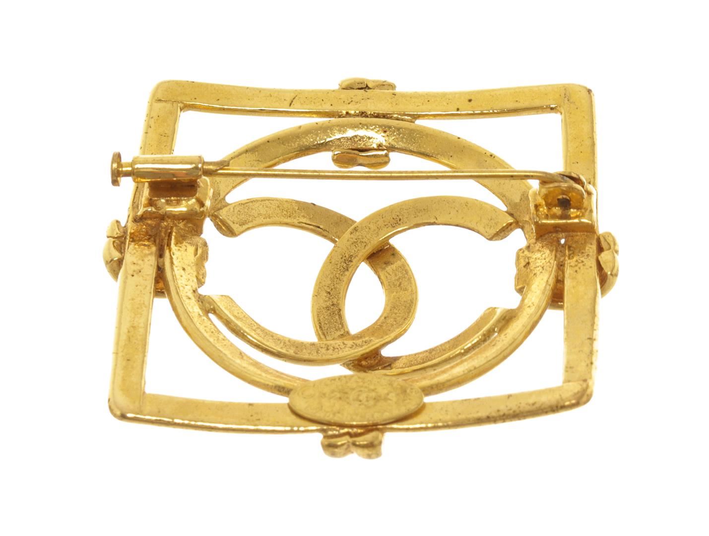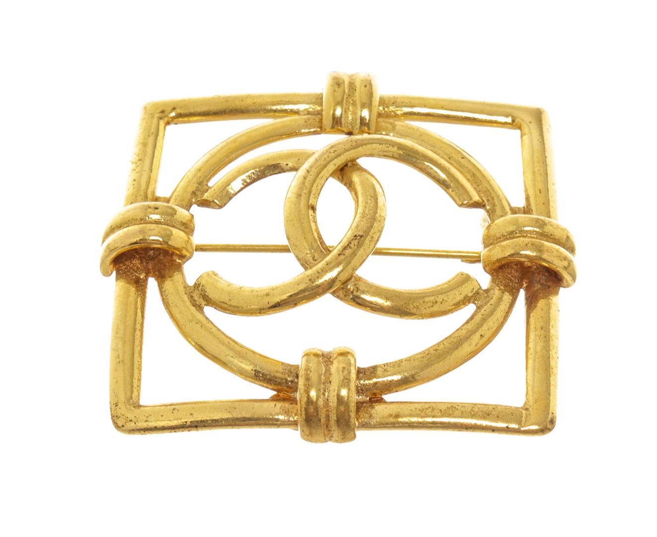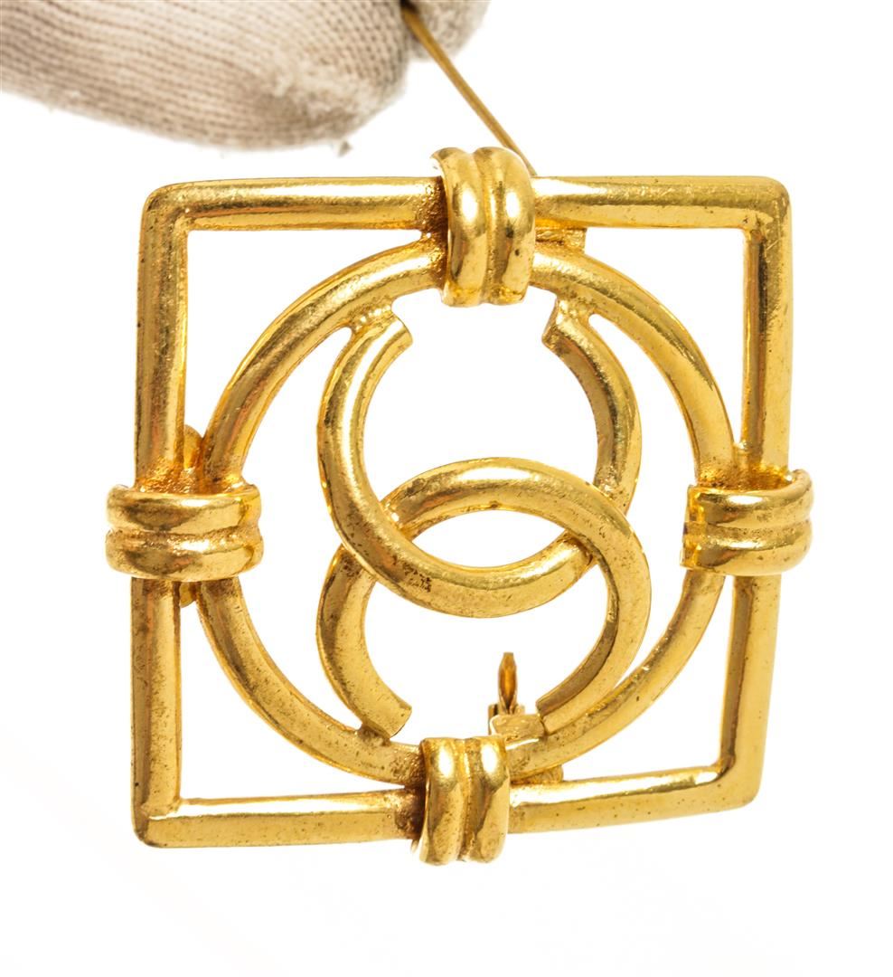 One Chanel Gold CC Square Brooch. Item is sold AS-IS. All available information is listed in the description and shown in the photo. Chanel CC brooch with square design and an interlocking CC logo in a circle inside the square, gold-tone body, and pin closure.