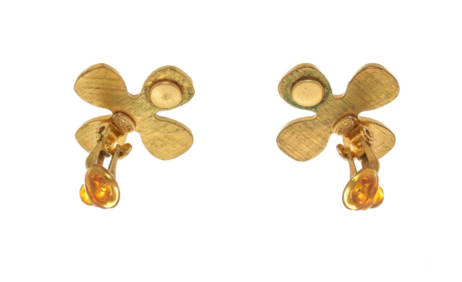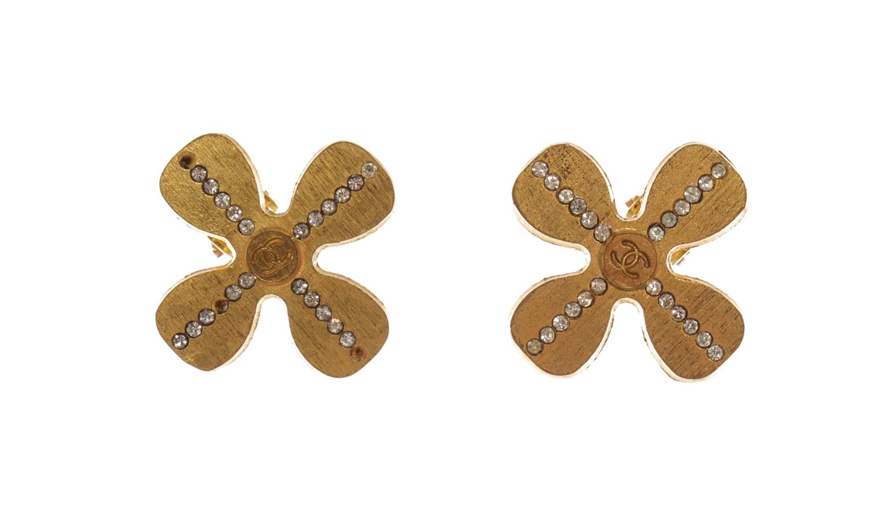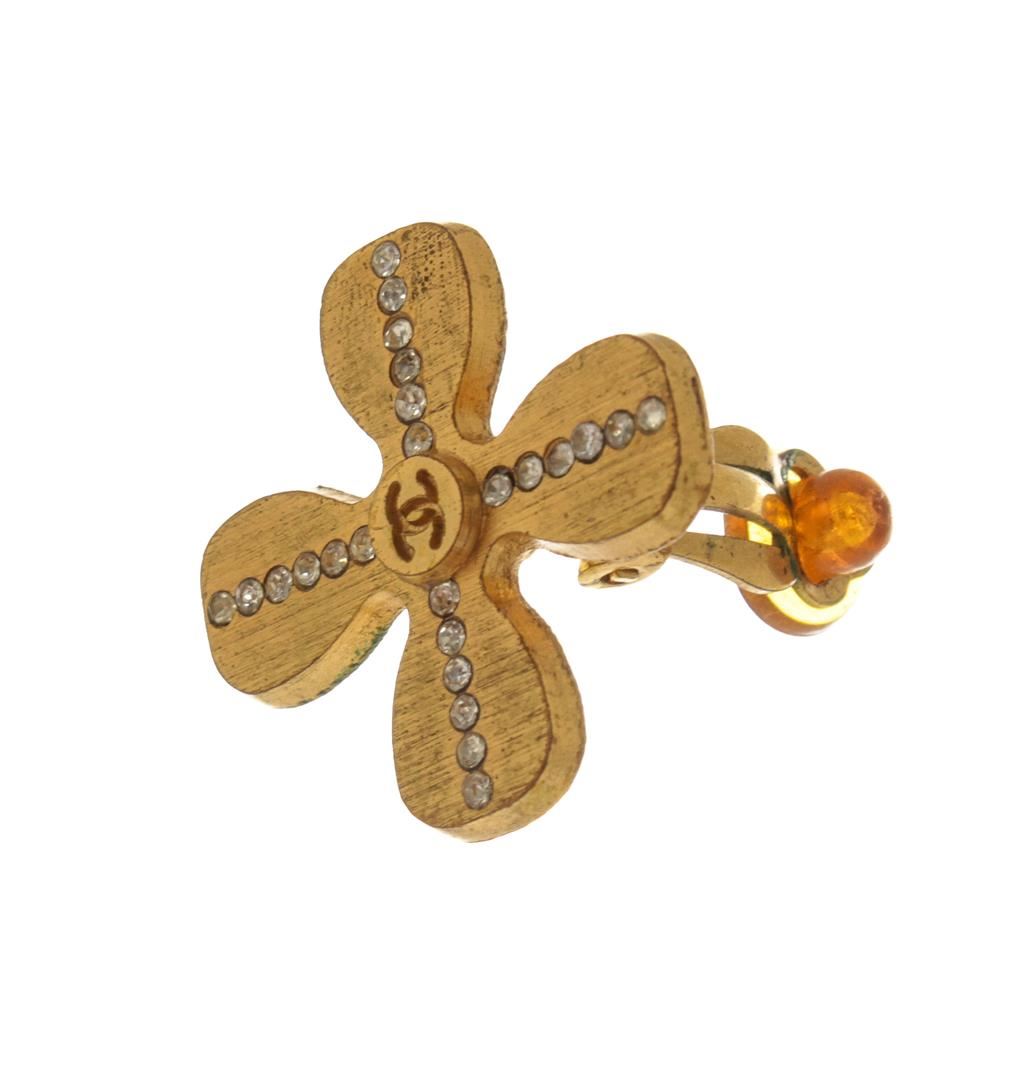 Chanel Gold Camelia Rhinestones Earrings. All available information is listed in the description and shown in the photos. Chanel Gold Camelia Rhinestones Earrings with gold tone metal hardware, logo engraving, and made in France.