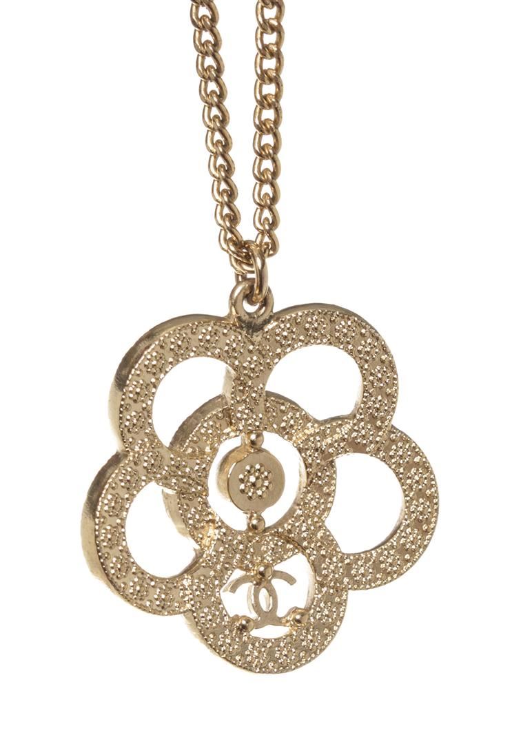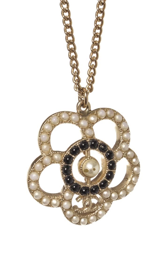 Chanel Gold Camellia Pearl Necklace. All available information is listed in the description and shown in the photos. Chanel Gold Camellia Pearl Necklace with CC logo pendant with faux pearls and gold tone metal hardware.
