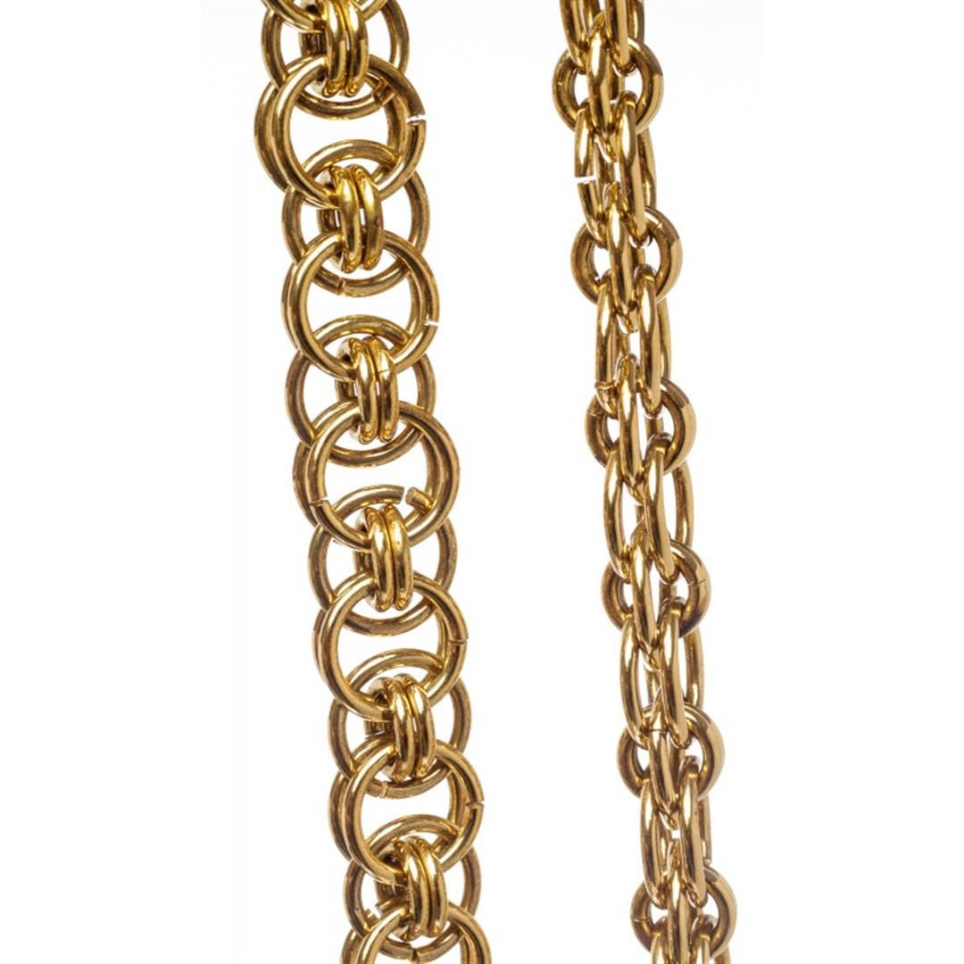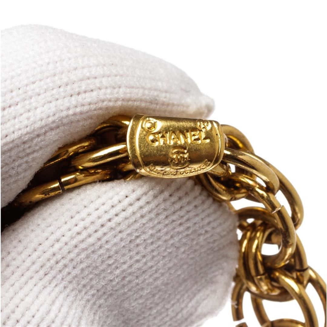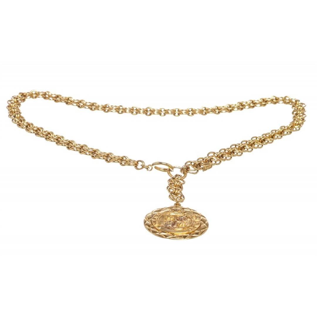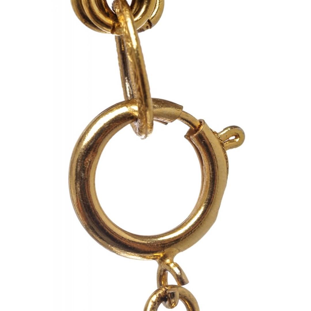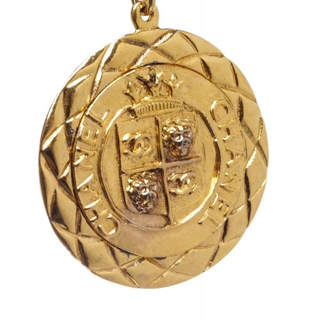 One Chanel Gold Chain Link Medallion Long Necklace. Chanel gold chain link medallion drop pendant long necklace. Overall clasp closure.