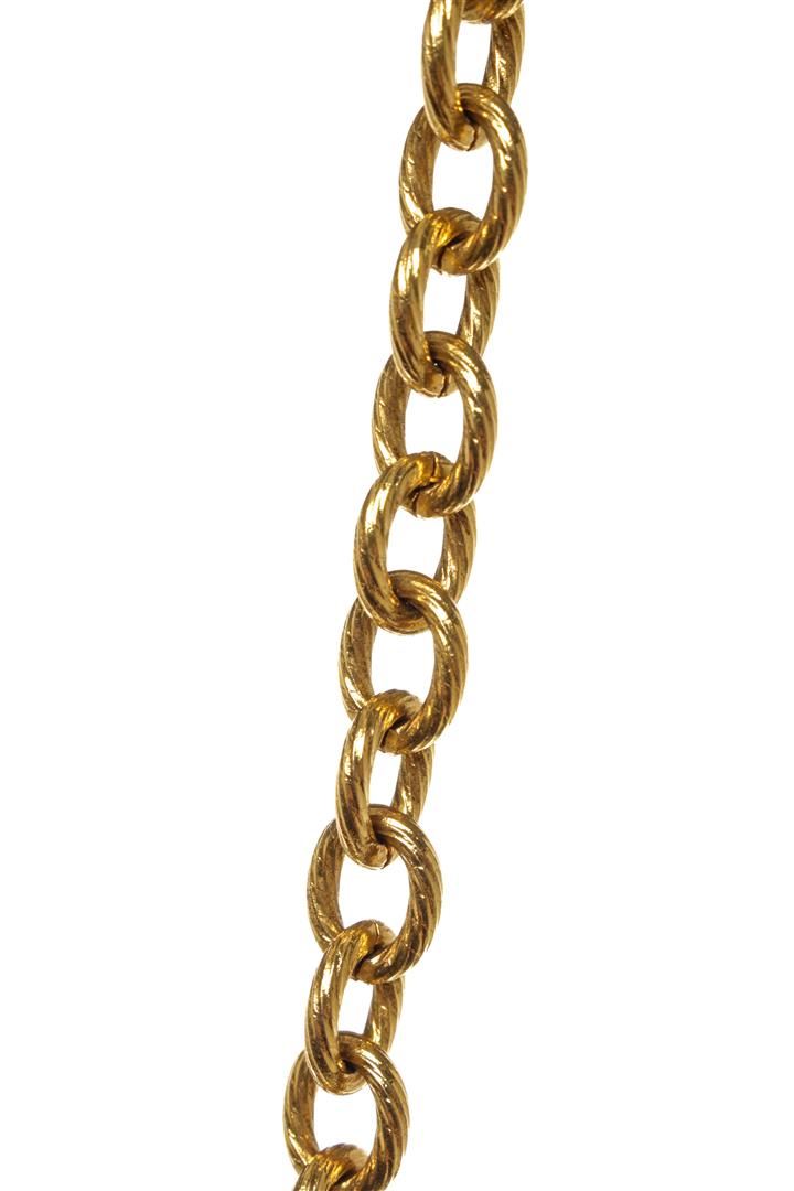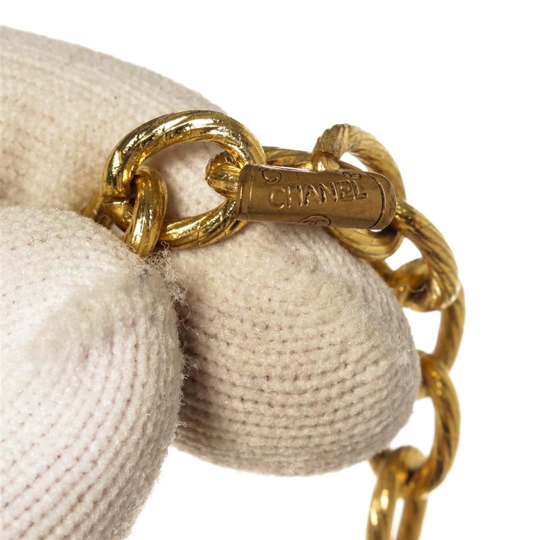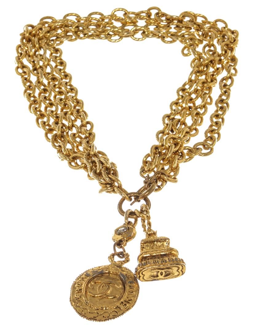One Chanel Gold Coco Mark Two Pendants Multi-Strand Necklace. Item is sold AS-IS. All available information is listed in the description and shown in the photo. Chanel Gold Coco Mark Two Pendants Multi-Strand Necklace with gold tone metal hardware and pendants, two pendants, a clear rhinestone accent. Made in France.