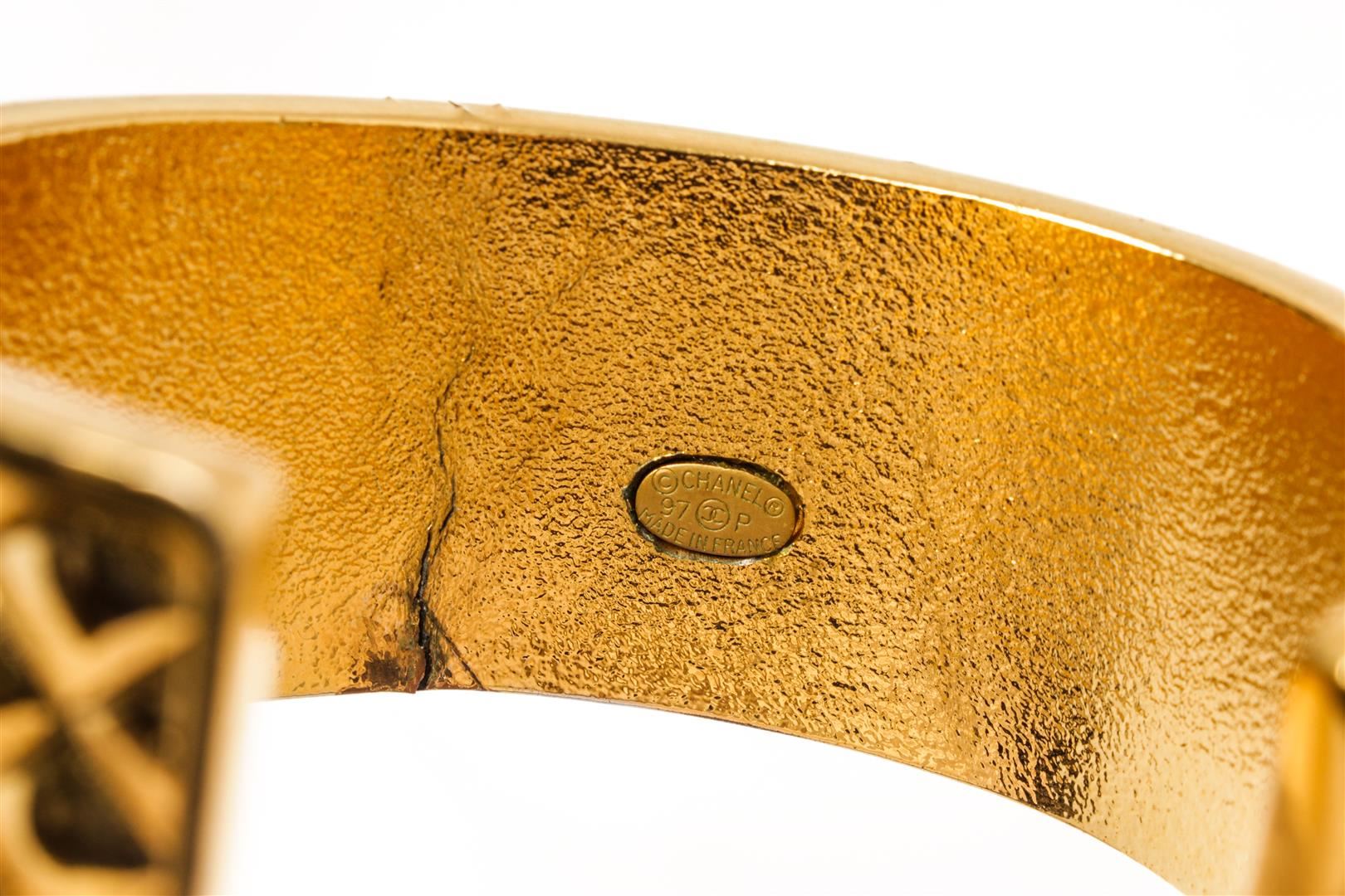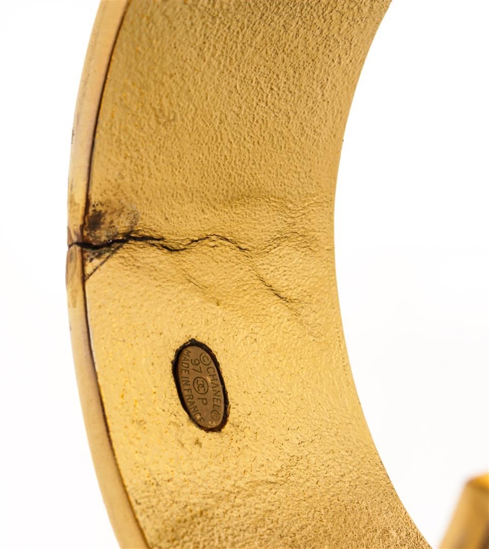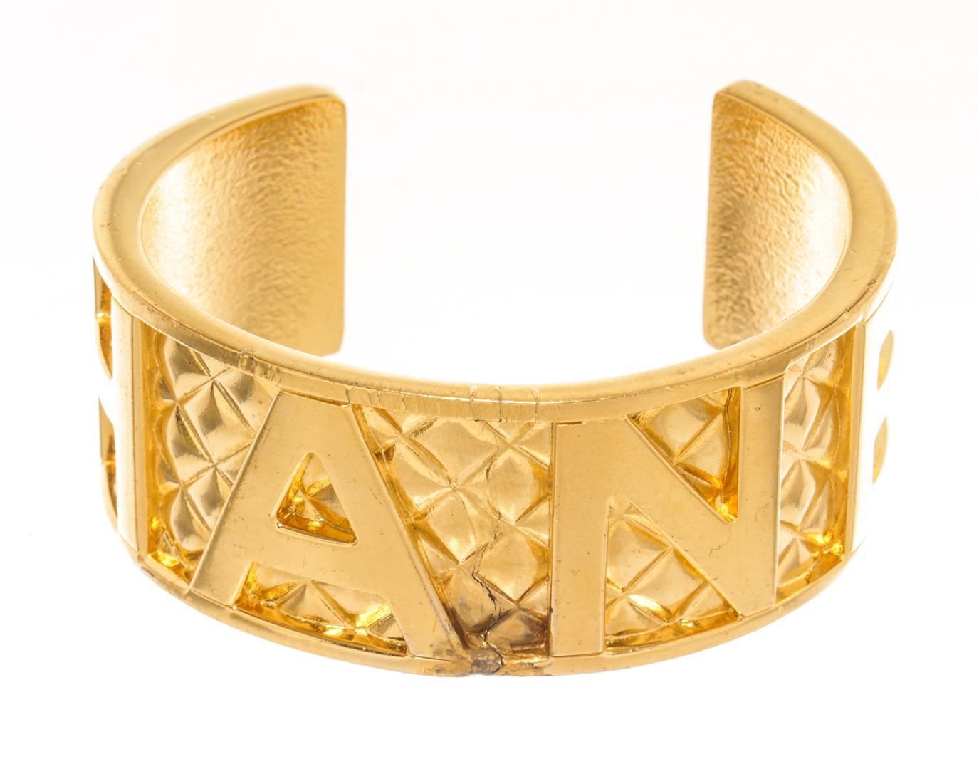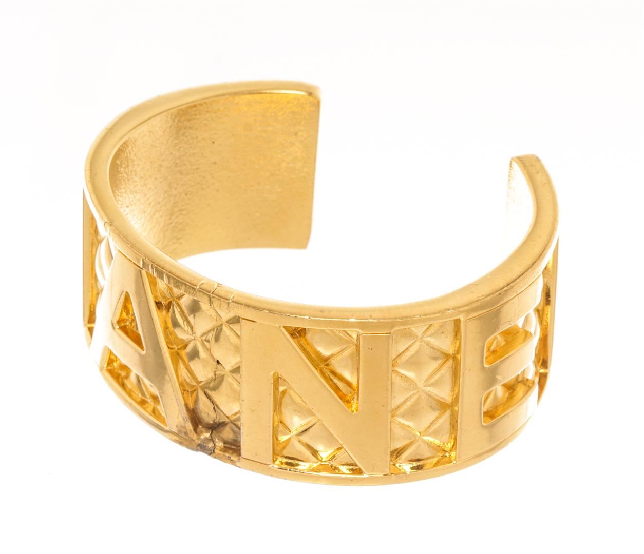 Chanel Gold Cuff Bangle. All available information is listed in the description and shown in the photos. Chanel Gold Cuff Bangle with logo lettering, open cuff design, gold-tone hardware.