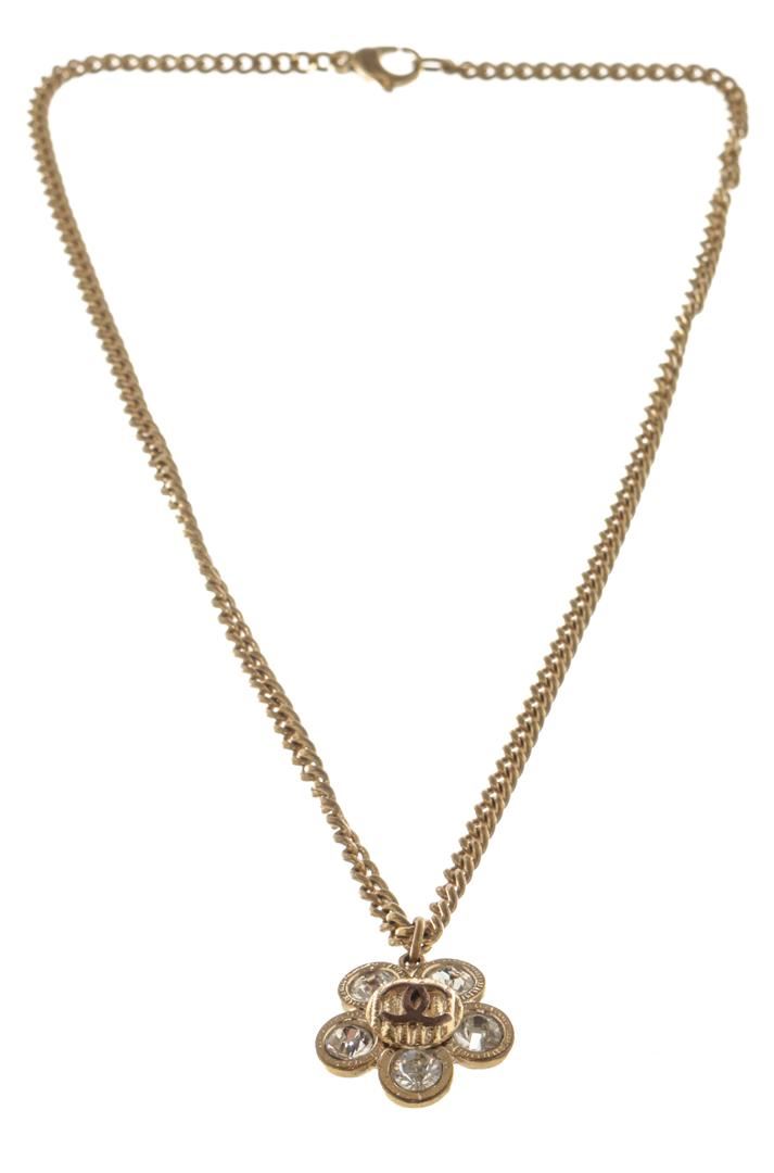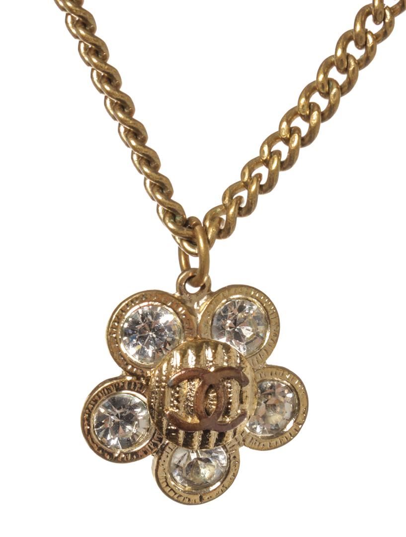 Chanel Gold Flower Necklace. All available information is listed in the description and shown in the photos. Chanel Gold Flower Necklace with gold tone hardware, flower pendant with CC logo with rhinestones.