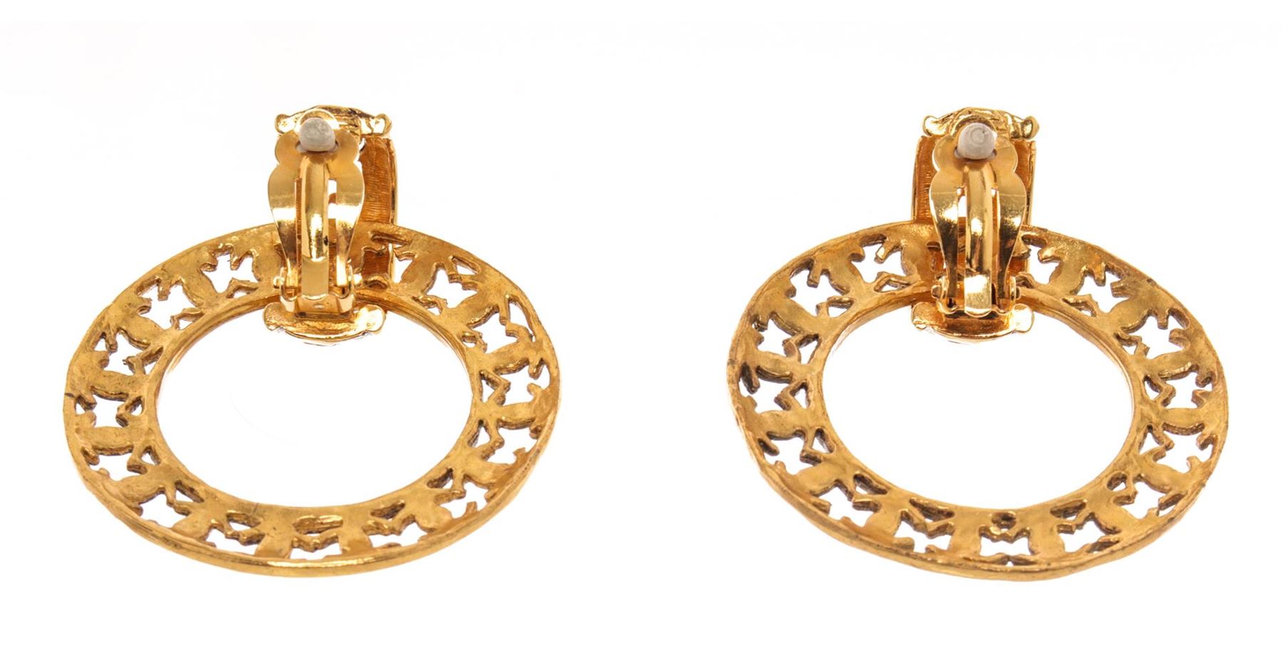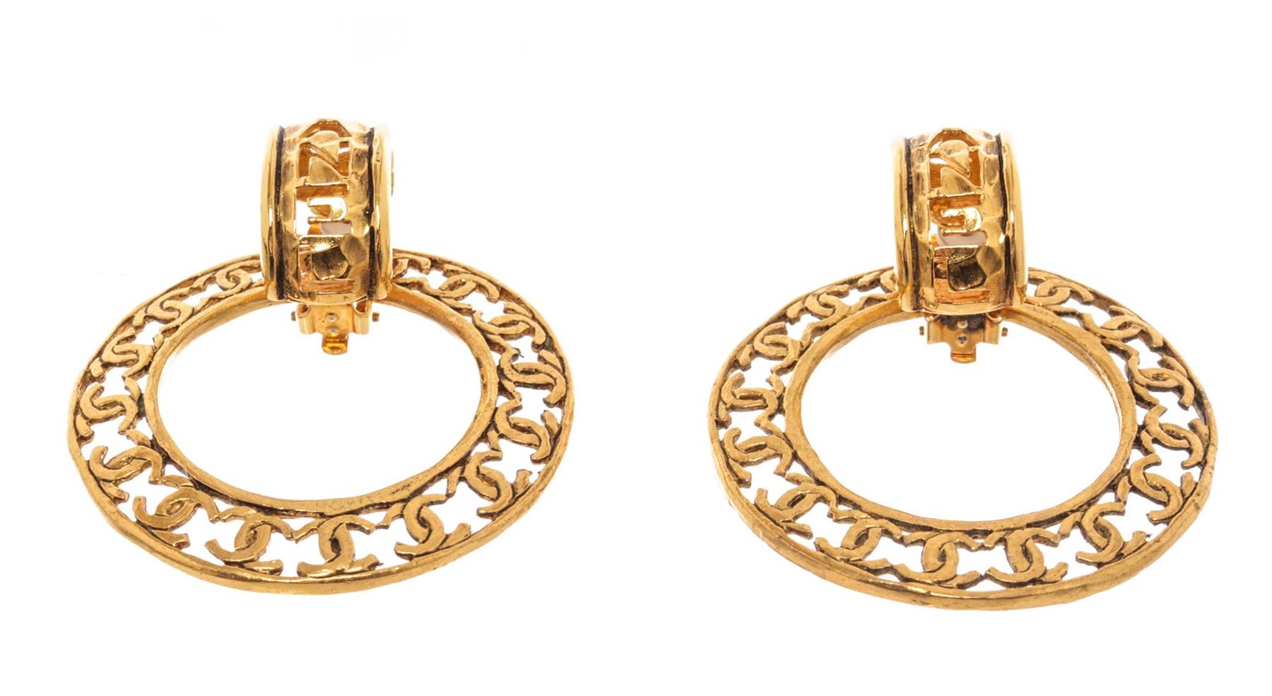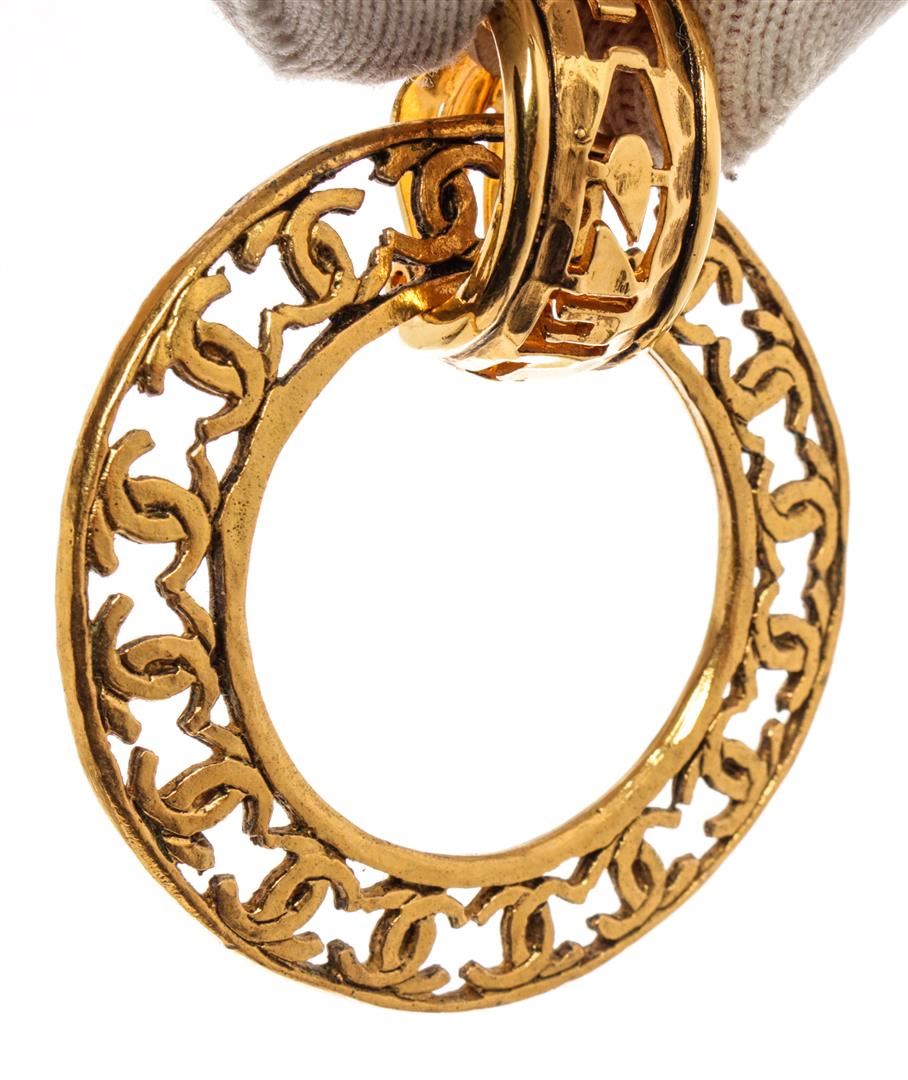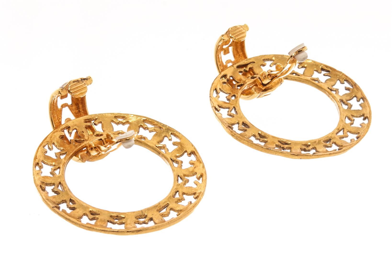 Chanel Gold Gilt Metal Large Round CC Earrings. All available information is listed in the description and shown in the photos. chanel Gold Gilt Metal Large Round CC Earrings with gold-tone hardware, two way use clip earrings, cc logos around the hoops and clip-on closures. 2" Width x 2" Height, / 5.08 x 5.08 Cm