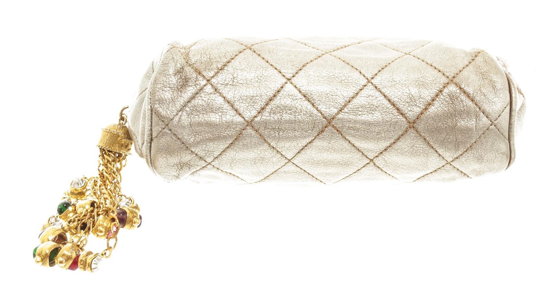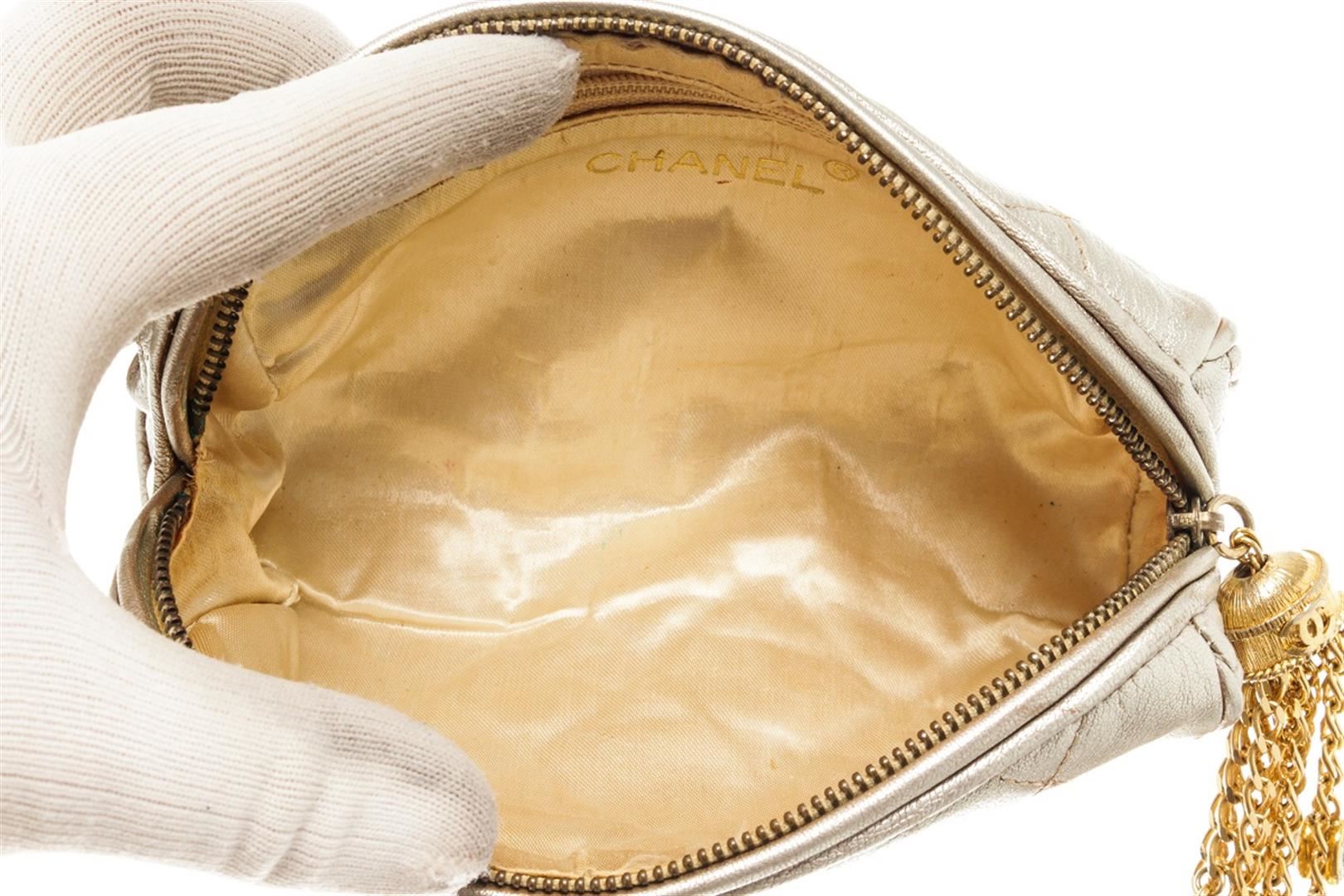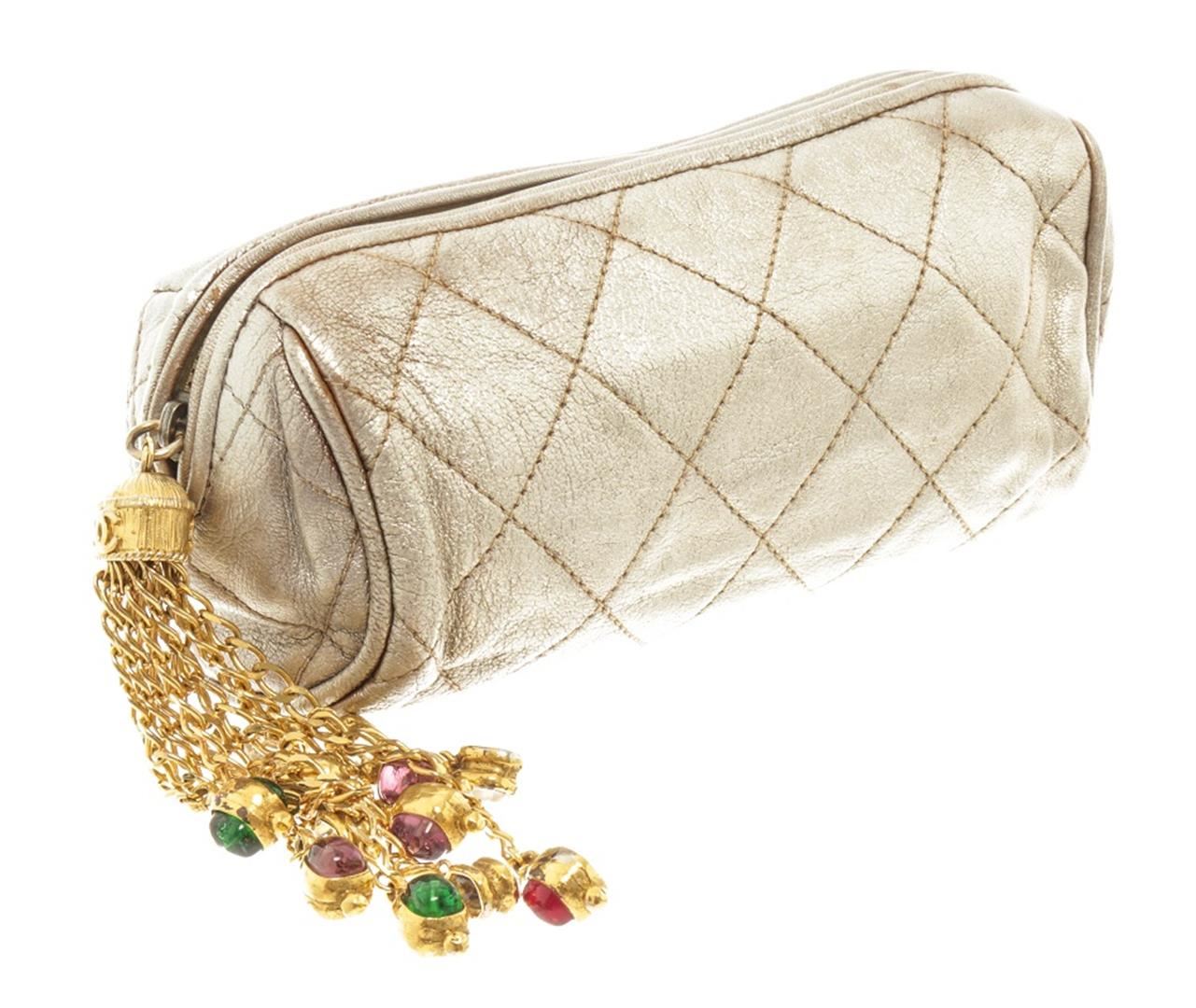 One Chanel Gold Leather Pouch with Tassel. Item is sold AS-IS. All available information is listed in the description and shown in the photo. Chanel gold leather pouch with tassel features soft metallic gold leather that is quilted in the signature Chanel diamond pattern exterior, gold-tone hardware, zip closure with an oversized Gripoix glass jeweled tassel, and beige satin lining. There are some wear on the canvas lining near the zipper, some discoloration on the canvas, cracking on the silver leather as well as discoloration. Please refer to photos! Height: 3" Width: 11" Depth: 3" , Shoulder Drop: / 7.62 x 7.62 x 22.86 Cm