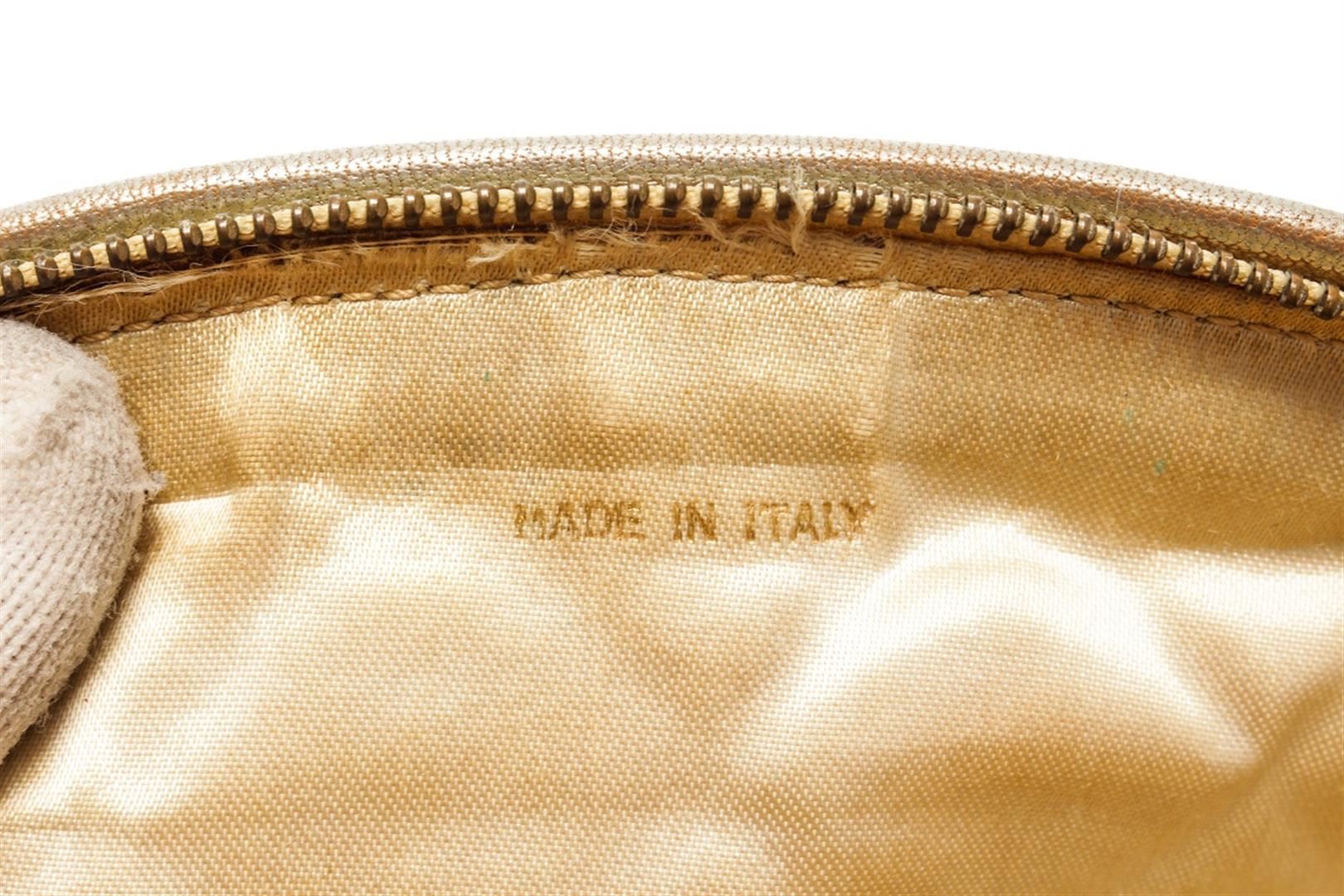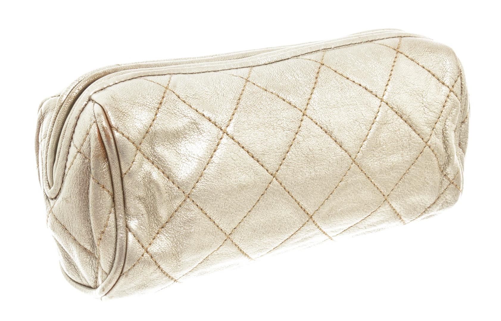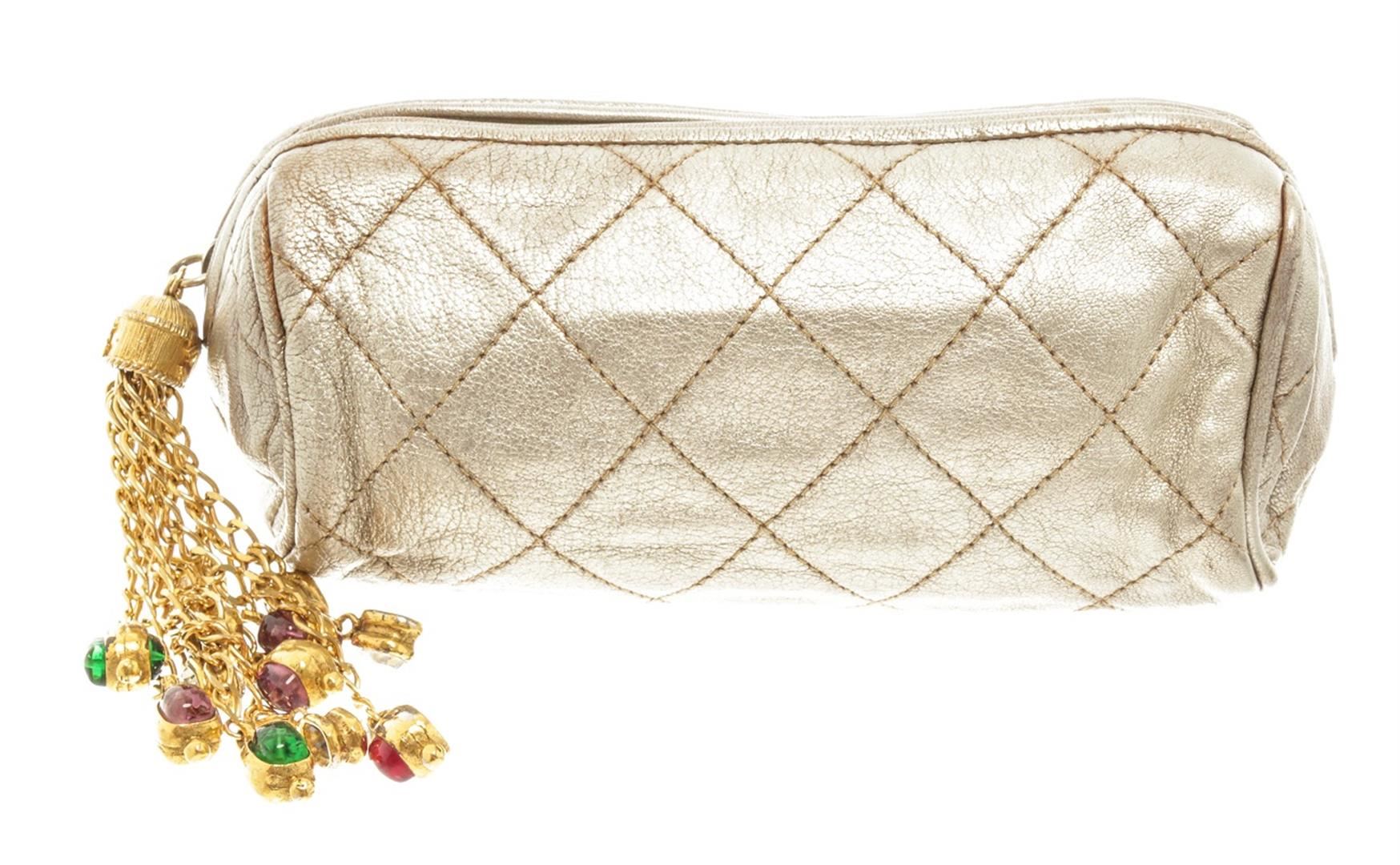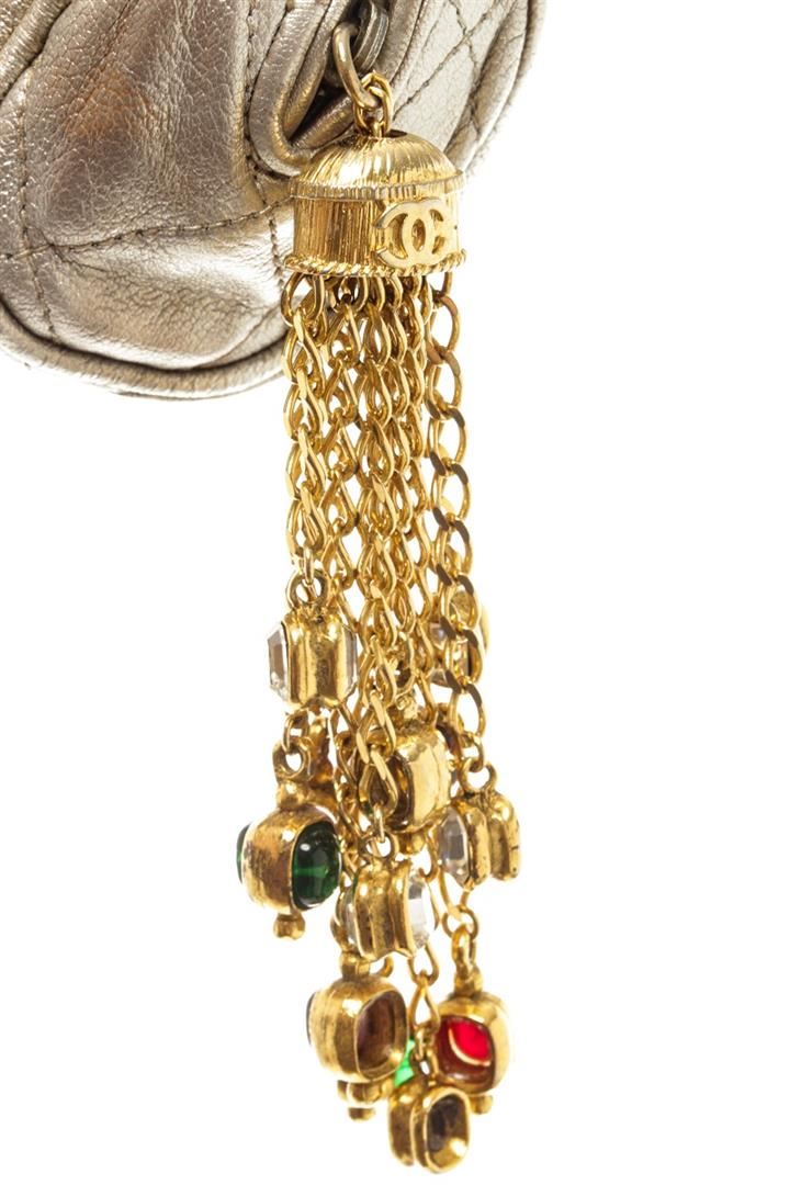 One Chanel Gold Leather Pouch with Tassel. Item is sold AS-IS. All available information is listed in the description and shown in the photo. Chanel gold leather pouch with tassel features soft metallic gold leather that is quilted in the signature Chanel diamond pattern exterior, gold-tone hardware, zip closure with an oversized Gripoix glass jeweled tassel, and beige satin lining. There are some wear on the canvas lining near the zipper, some discoloration on the canvas, cracking on the silver leather as well as discoloration. Please refer to photos! Height: 3" Width: 11" Depth: 3" , Shoulder Drop: / 7.62 x 7.62 x 22.86 Cm