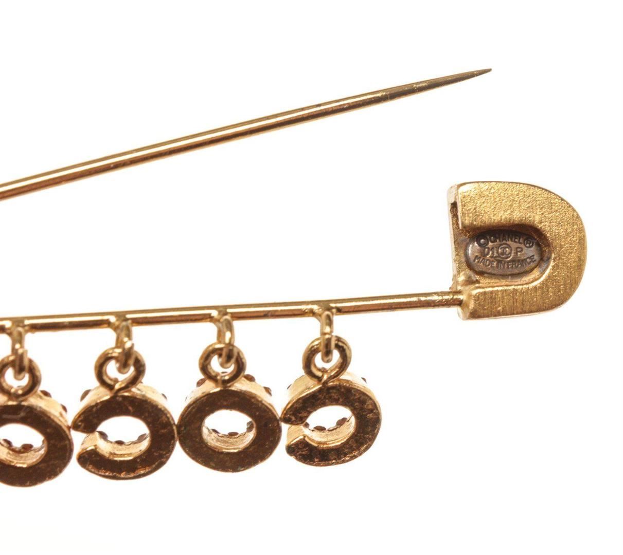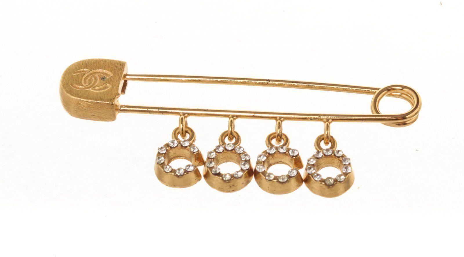 Chanel Gold Logo Safety Pin with gold-tone hardware and push lock closure.