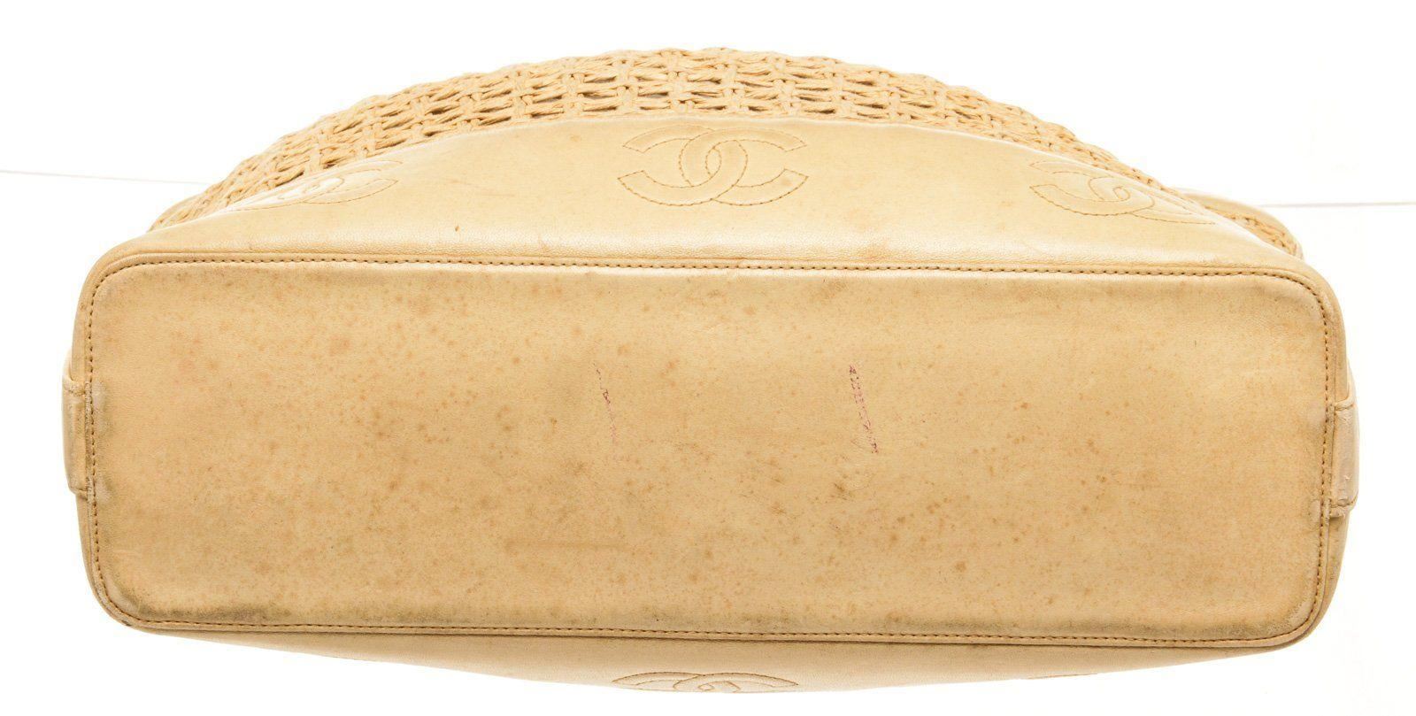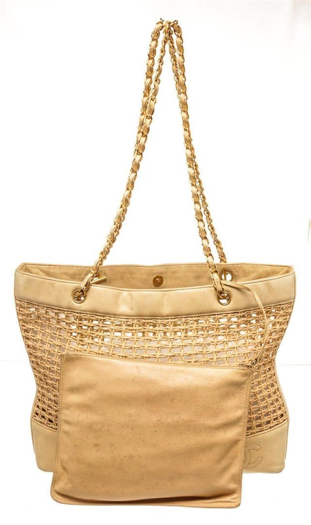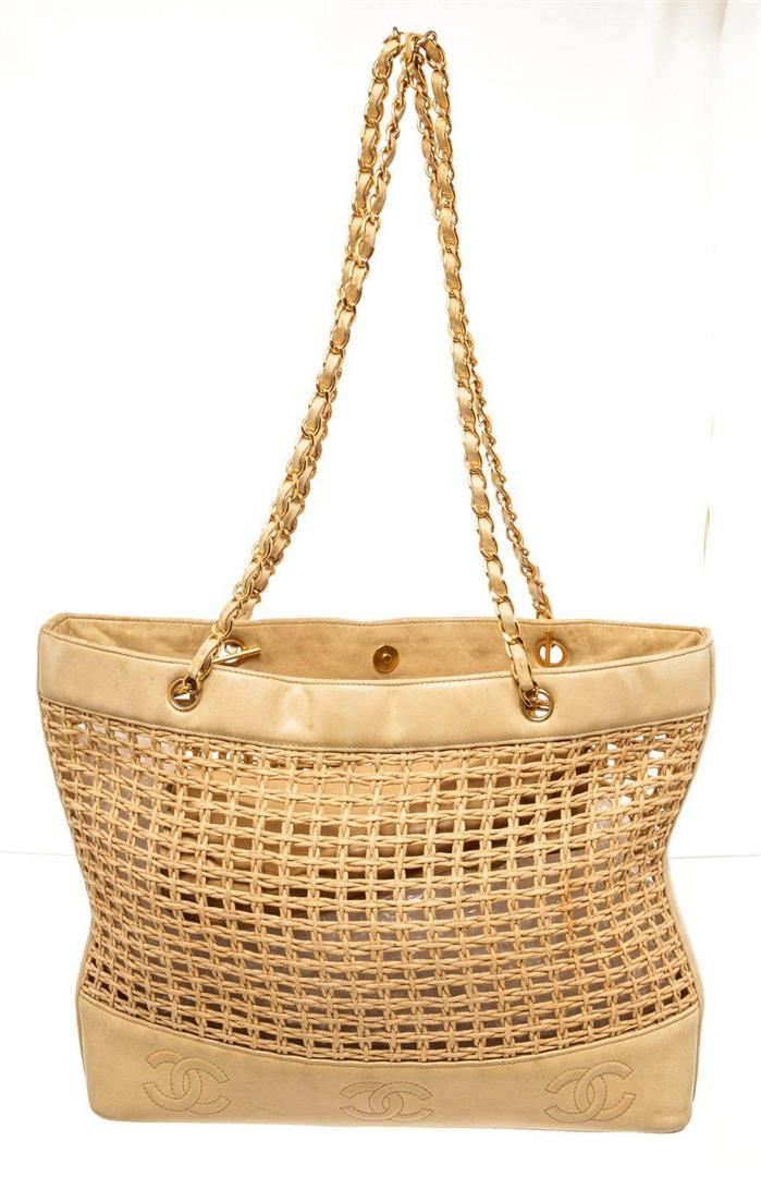Chanel Gold Mesh Strow Tote Bag with mesh, gold-tone hardware, dual flat top handles, single slip pocket at, tan contrast stitching, protective feet at base, one flap closure.