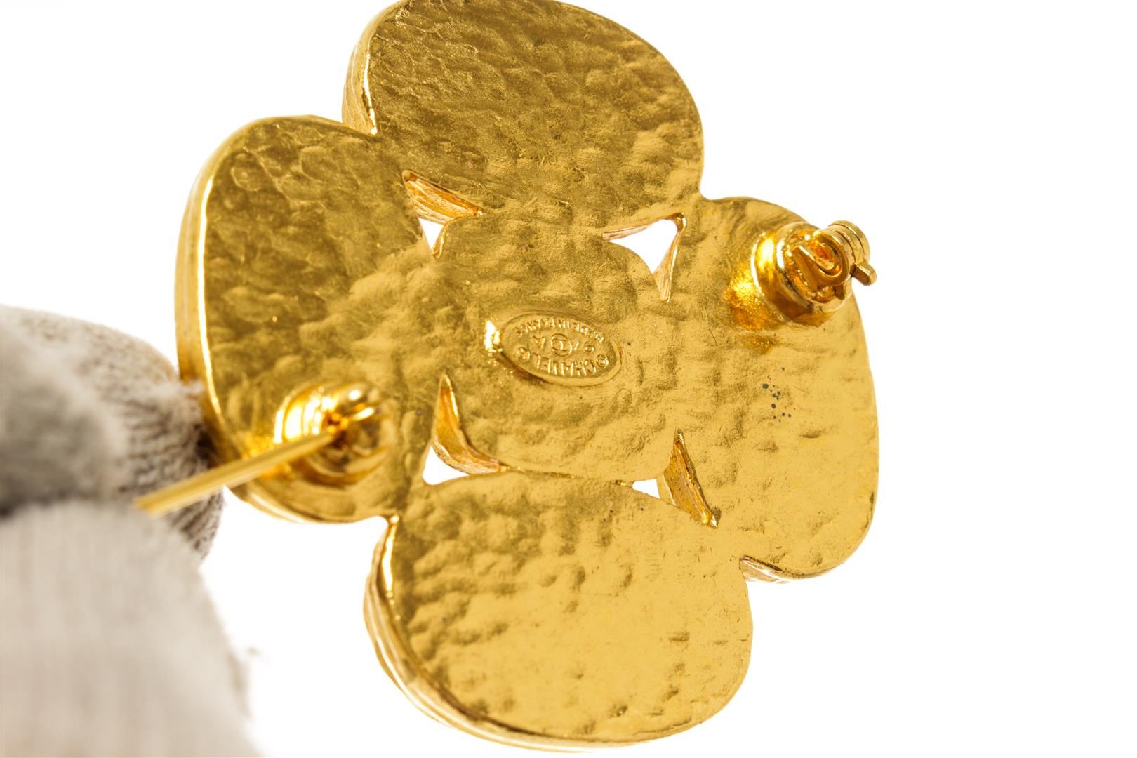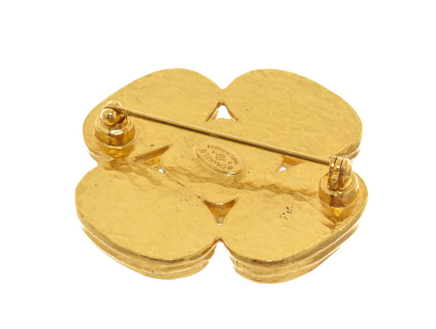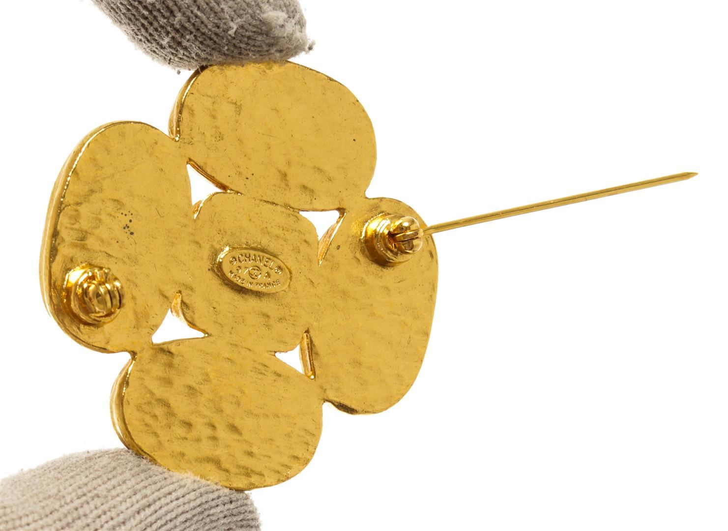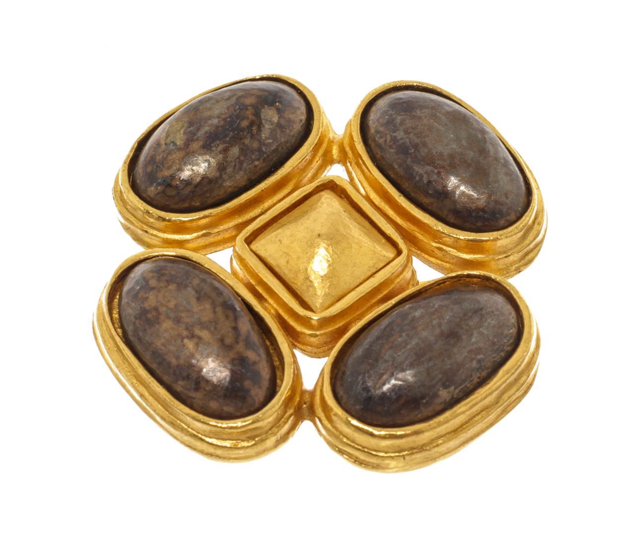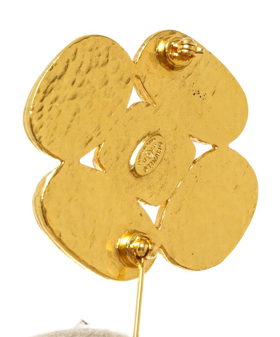 One Chanel Gold Metal Brooch. Item is sold AS-IS. All available information is listed in the description and shown in the photo. Chanel gold metal brooch with gold-toned body, four brown stone-like ovals, Chanel stamp of the back, and pin closure.