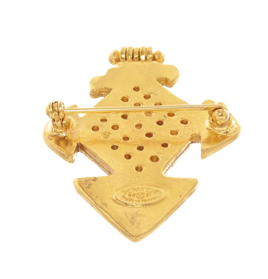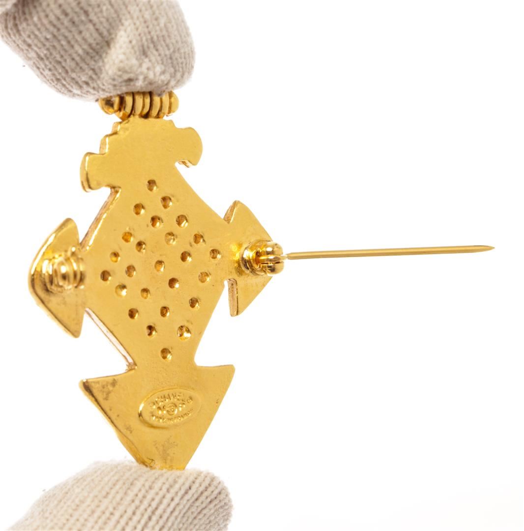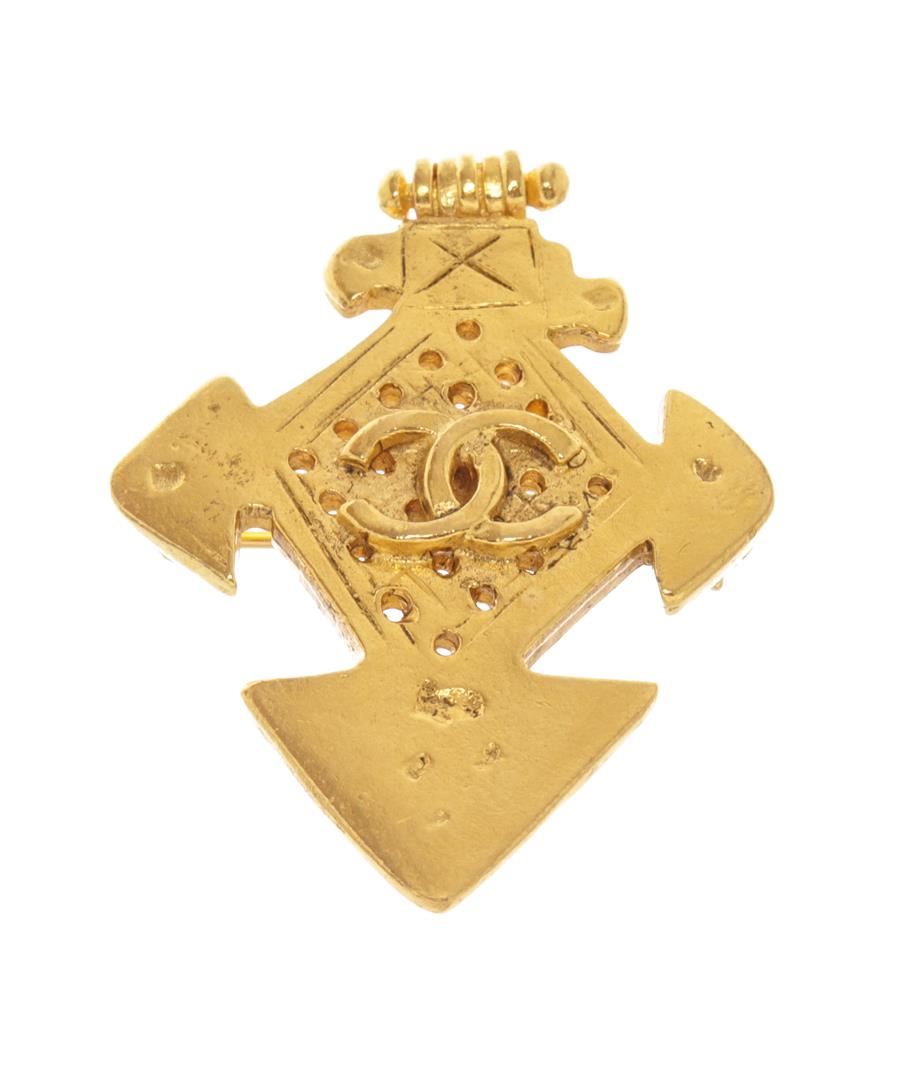 Chanel Gold Metal CC Cross Brooch. All available information is listed in the description and shown in the photos. Chanel Gold Metal CC Cross Brooch with it features a cc hammered cross with a perforated center and is crafted from gold plated metal, gold-tone hardware, pin closure on back. 1.25"L x 1.75"H, 3.17 x 4.44 Cm