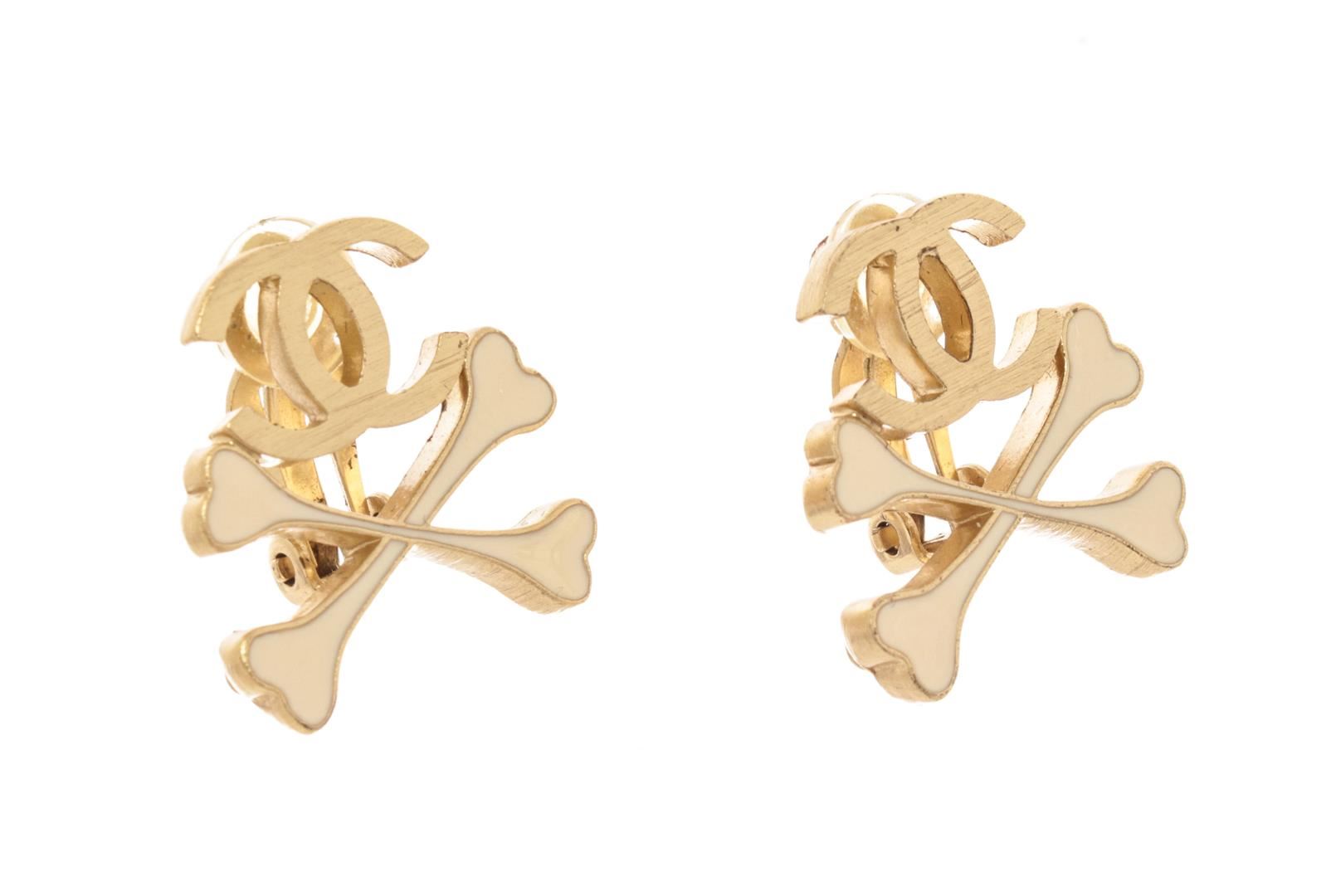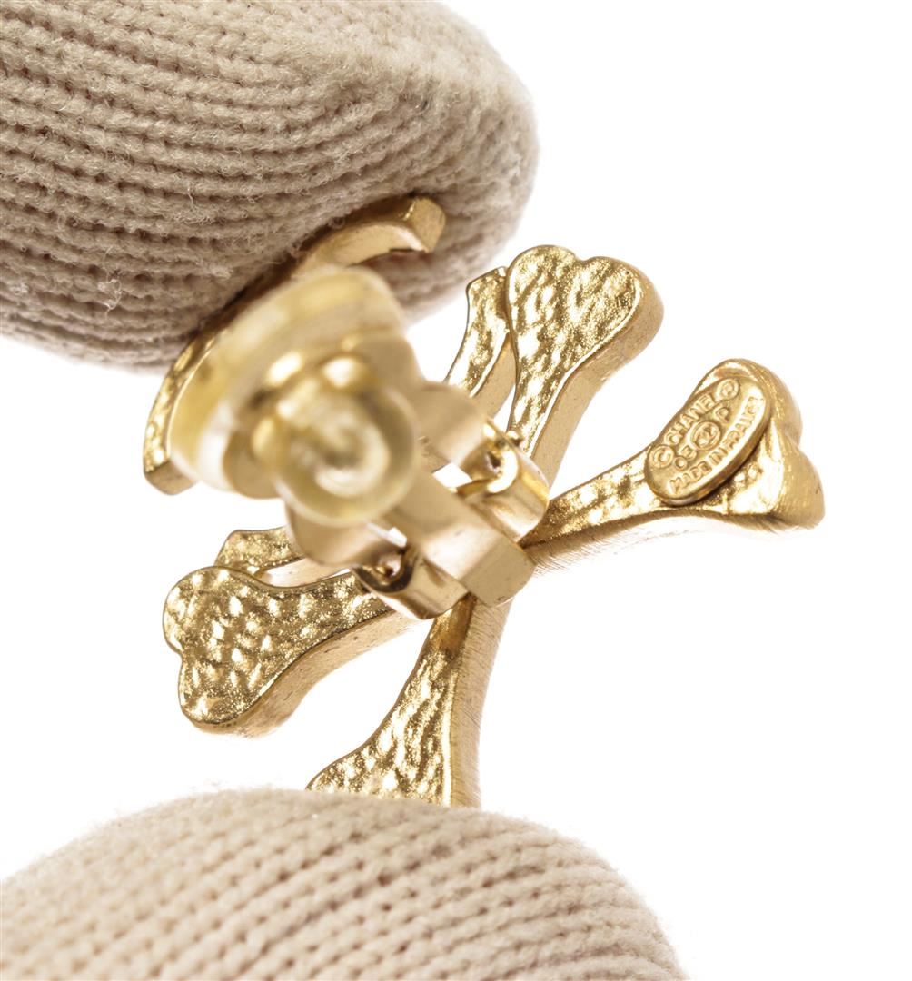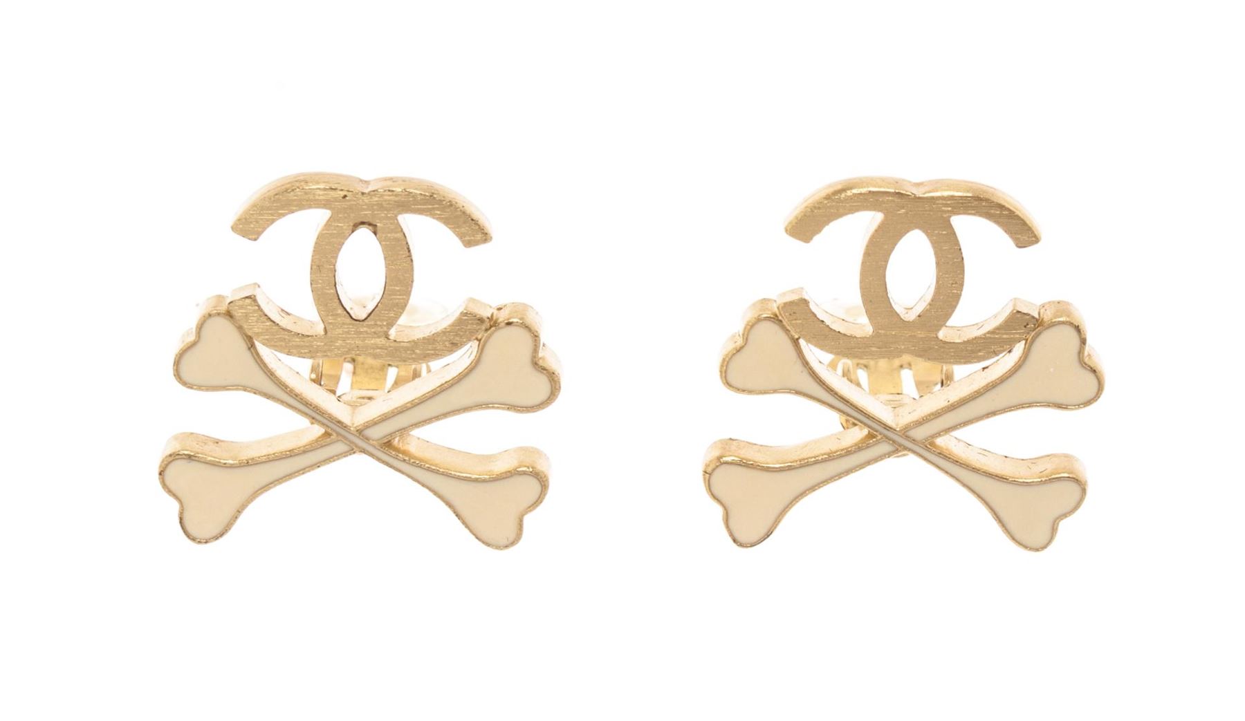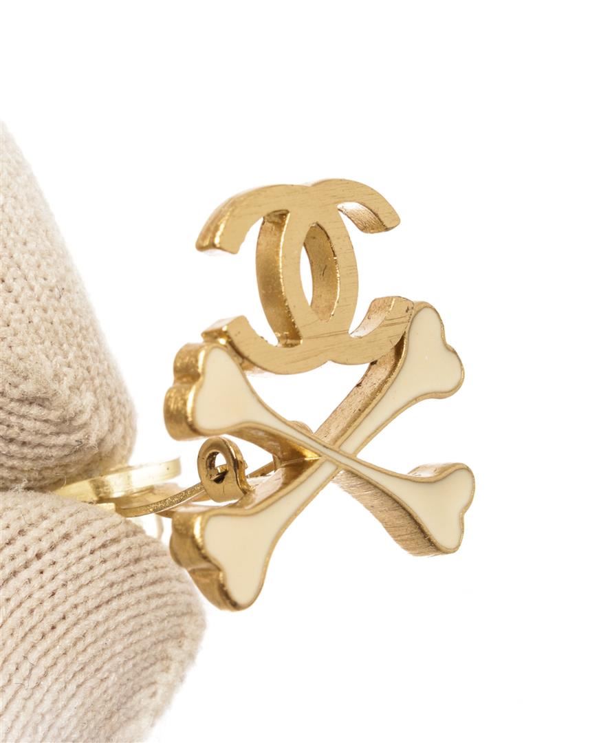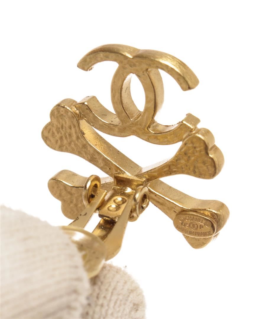 Chanel Gold Metal Coco Mark Clip On Earrings. All available information is listed in the description and shown in the photos. Chanel Gold Metal Coco Mark Clip On Earrings with gold-tone hardware, very rare cc logo cross bone dangle, signature interlocking cc logo, clip on fastening.