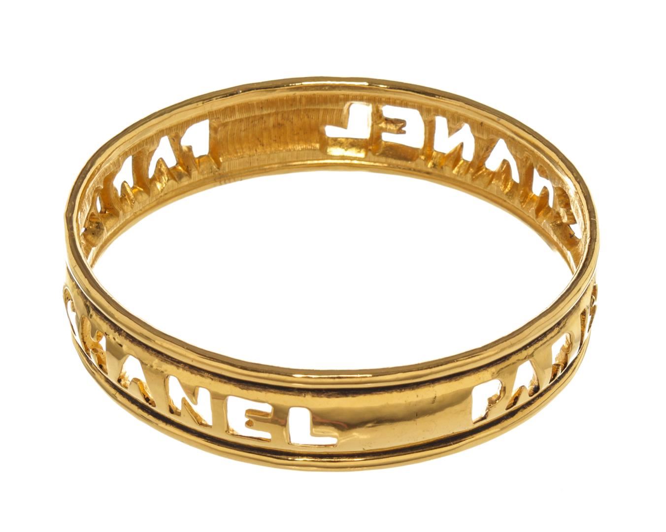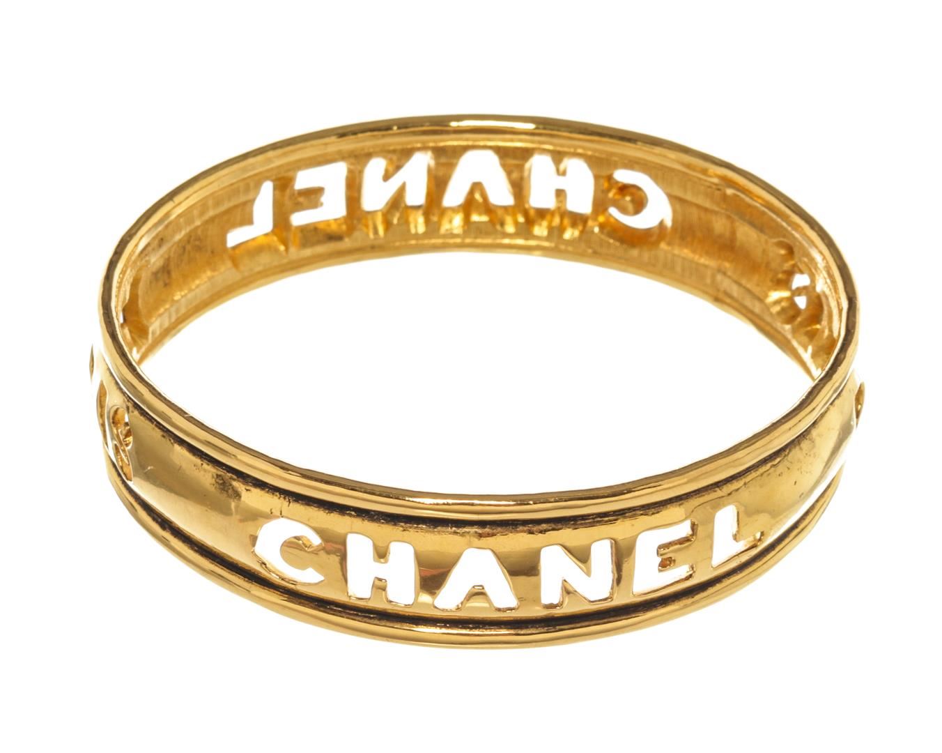 Chanel Gold Metal Cut Out Logo Bangle Bracelet. All available information is listed in the description and shown in the photos. Chanel Gold Metal Cut Out Logo Bangle Bracelet with a Circumference of 8.75"