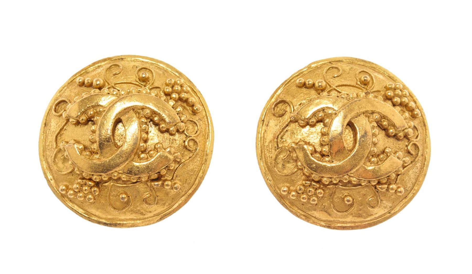 Chanel Gold Metal Round CC Logo Clip On Earrings. All available information is listed in the description and shown in the photos. Chanel Gold Metal Round CC Logo Clip On Earrings with gold-tone hardware, gold plated metal with floral and vine details, clip-on closure on back.