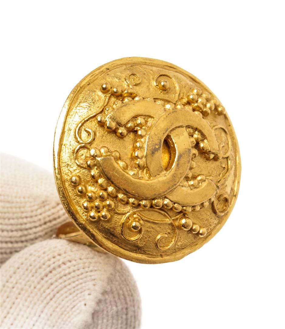 Chanel Gold Metal Round CC Logo Clip On Earrings. All available information is listed in the description and shown in the photos. Chanel Gold Metal Round CC Logo Clip On Earrings with gold-tone hardware, gold plated metal with floral and vine details, clip-on closure on back.