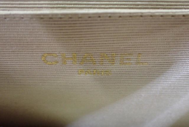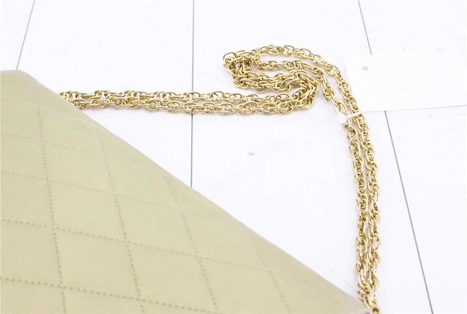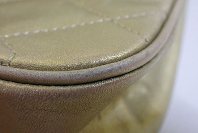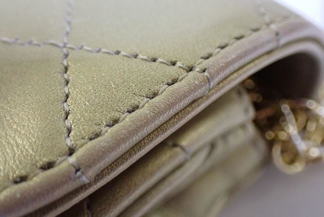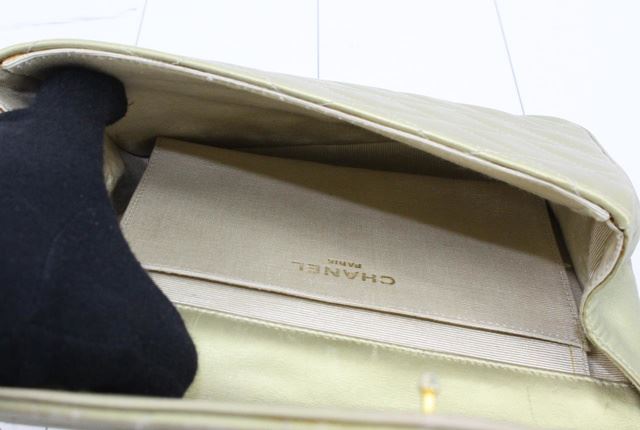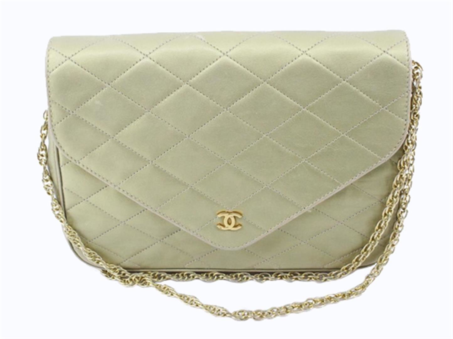 Gold metallic quilted leather Chanel CC Envelope Flap shoulder bag with gold-tone hardware, an interlocking CC logo at front flap, chain-link shoulder strap, front flap that will open to beige canvas lining and one slip pocket inside. Height: 7" Width: