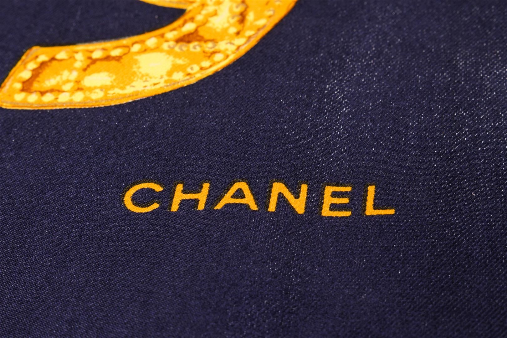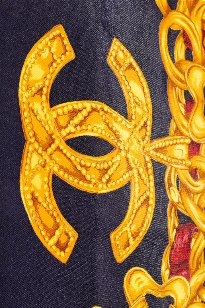 Chanel Gold Navy Silk Chain Scarf. All available information is listed in the description and shown in the photos. chanel gold navy silk chain scarf