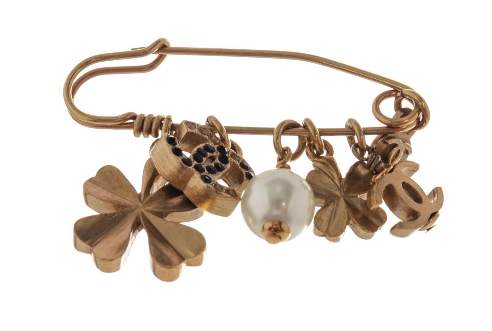 Gold Chanel Pin Charm Brooch with flowers, Chanel logo, pearl ornaments and gold-tone hardware.
