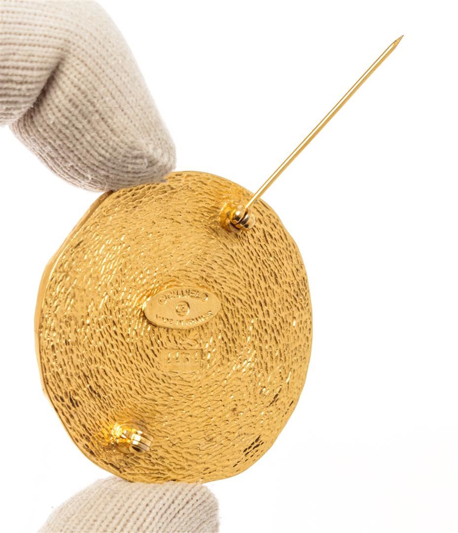 Chanel Gold Plated Rue Cambon Brooch. All available information is listed in the description and shown in the photos. Chanel Gold Plated Rue Cambon Brooch with enriched gold plated brass brooch in a round shape, embossed with iconic 3301 rue cambon paris logo, the brooch is stamped with an authenticity mark, the pin on the back is secure with excellent tension.