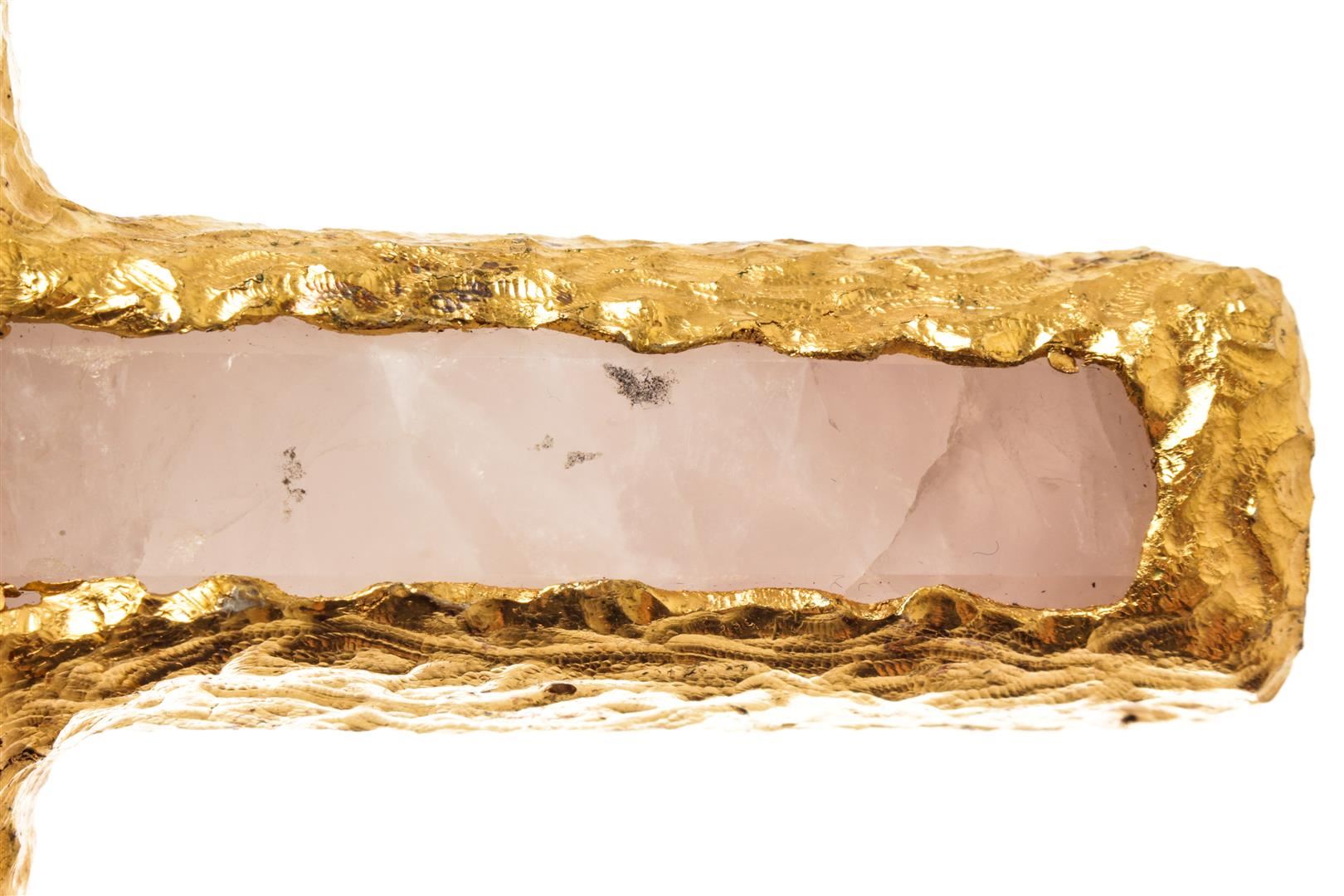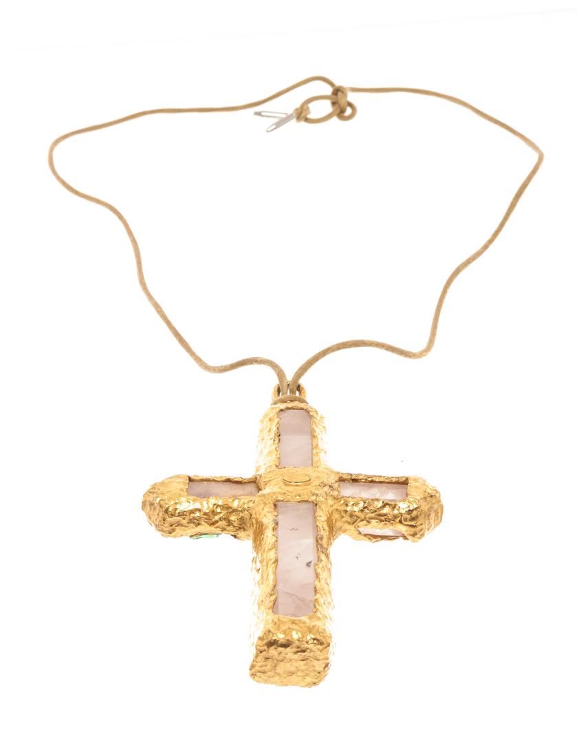 Chanel Gold Runway Rose Quartz & Gripoix Goosens Cross Pendant Necklace. All available information is listed in the description and shown in the photos. Chanel Gold Runway Rose Quartz & Gripoix Goosens Cross Pendant Necklace with gold-tone hardware, gold cord, rock crystal material, multicoloured glass, no fastening, a long leather necklace. 5.25" H x 3.75" W / 13.33 x 9.52 Cm