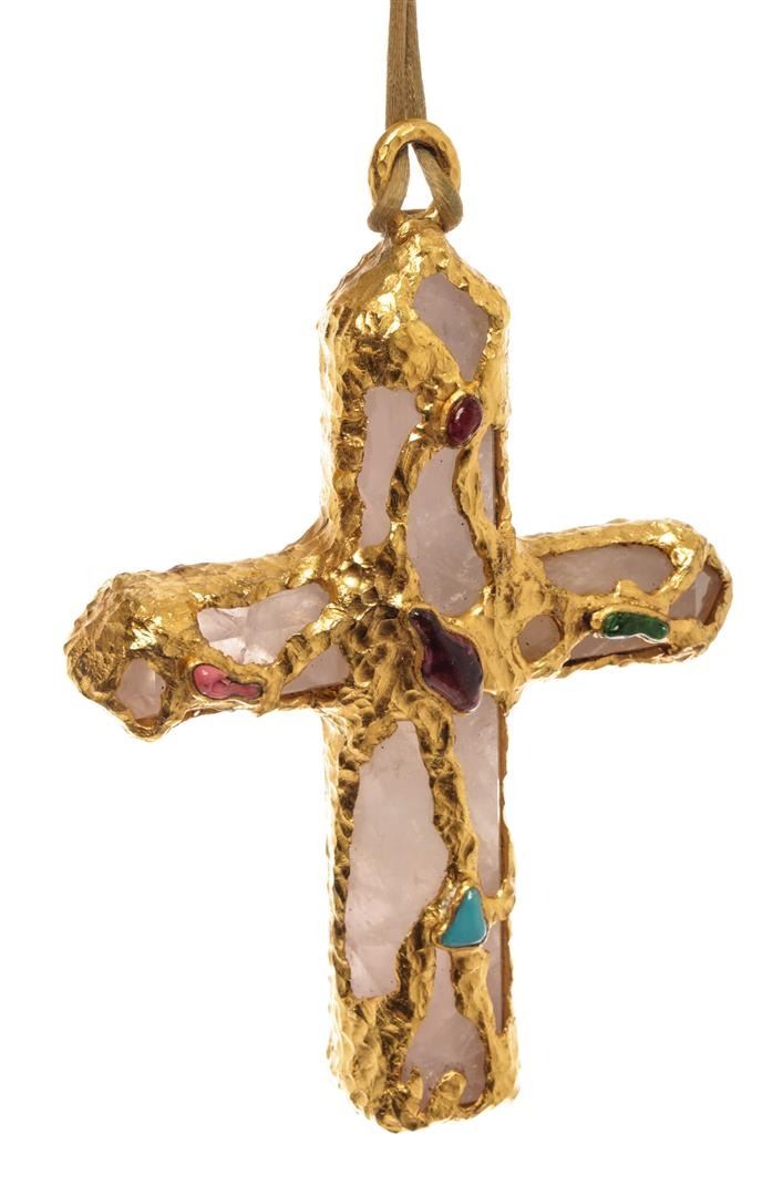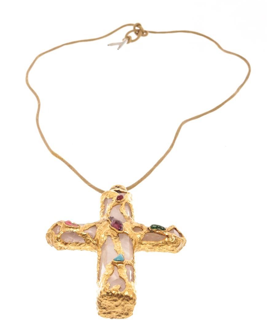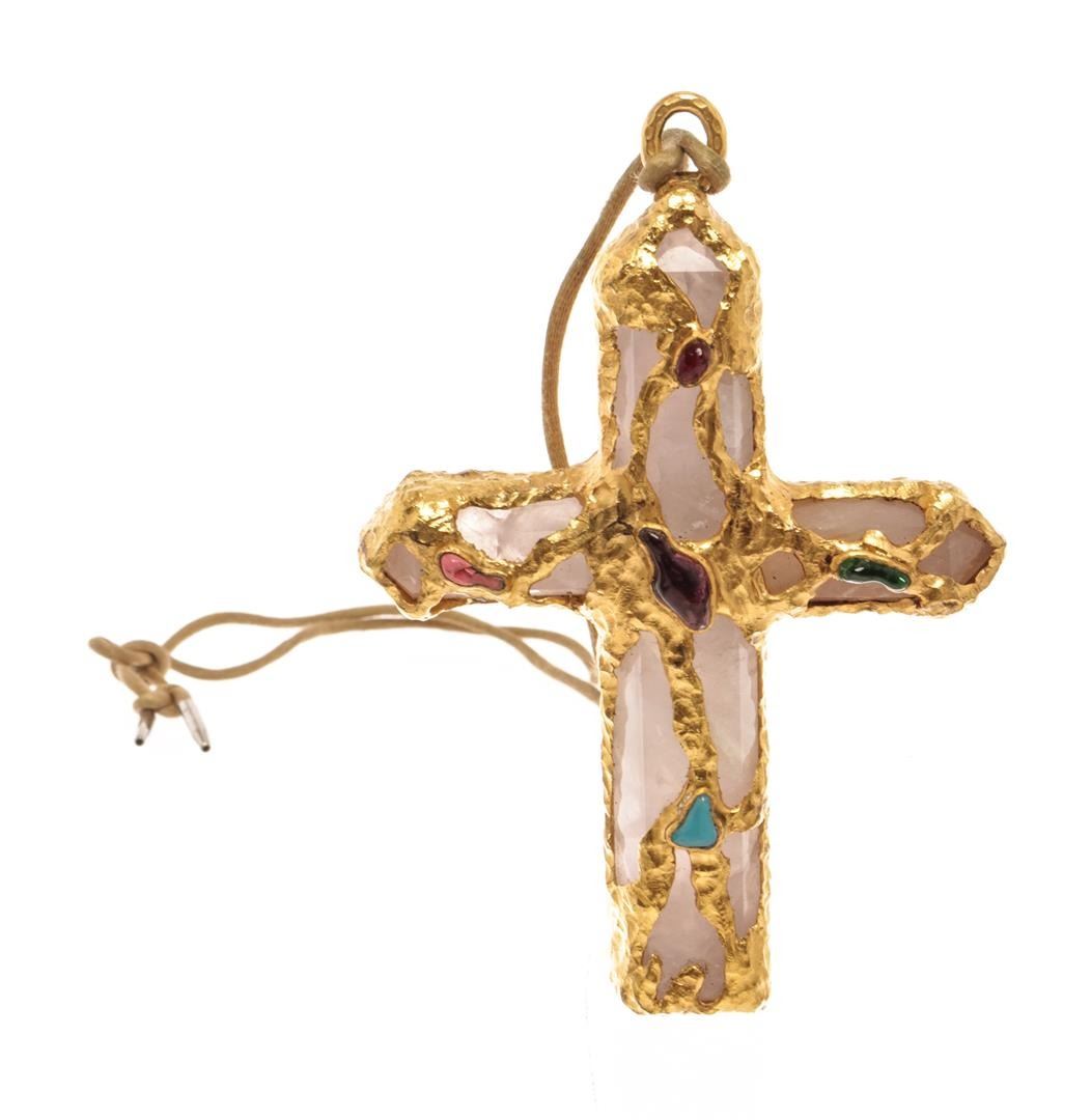 Chanel Gold Runway Rose Quartz & Gripoix Goosens Cross Pendant Necklace. All available information is listed in the description and shown in the photos. Chanel Gold Runway Rose Quartz & Gripoix Goosens Cross Pendant Necklace with gold-tone hardware, gold cord, rock crystal material, multicoloured glass, no fastening, a long leather necklace. 5.25" H x 3.75" W / 13.33 x 9.52 Cm