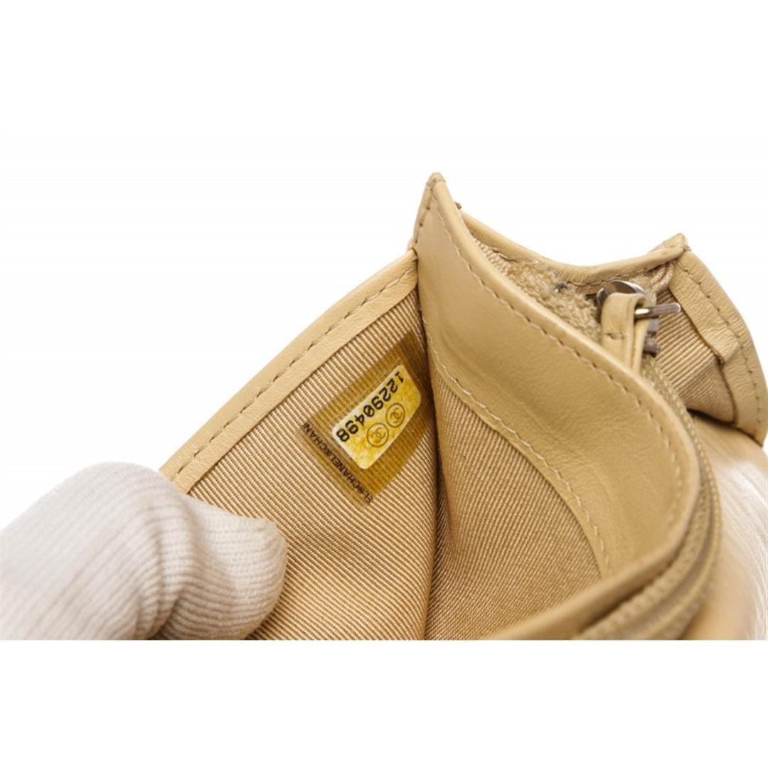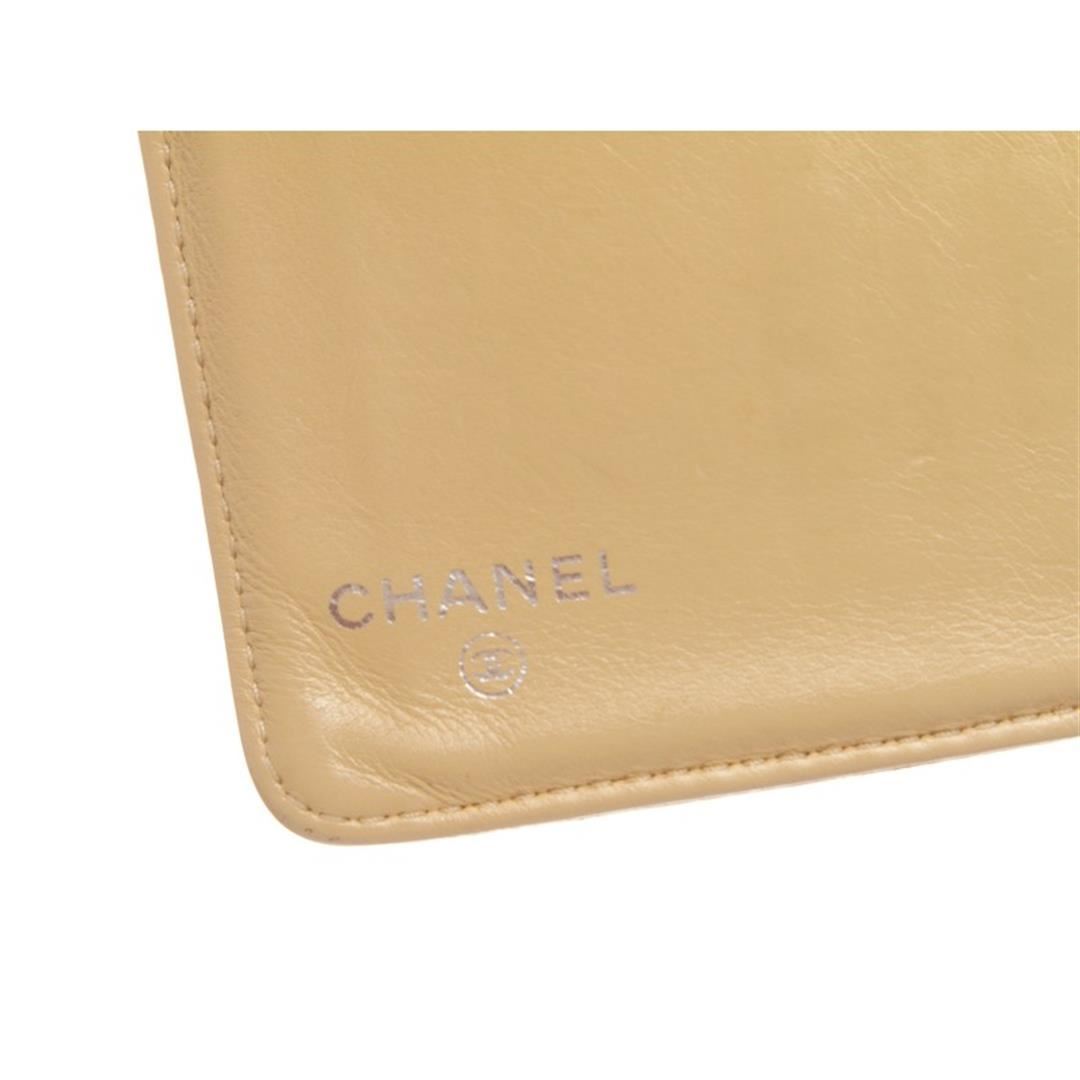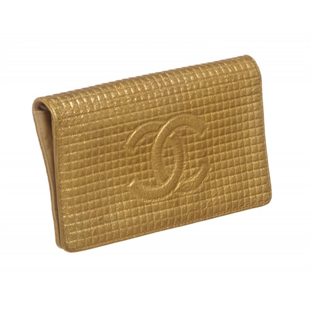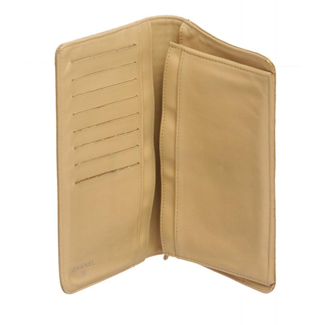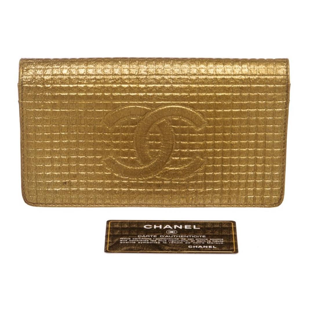 One Chanel Gold Textured Leather CC Flap Bi Fold Wallet. Gold Chanel wallet with silver-tone hardware, tonal leather interior with nude fabric lining, one with zip pull closure, dual bill compartment, eight cardots and fold closure flap. Item is pre-owned.