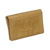 Gold Chanel wallet with silver-tone hardware, tonal leather interior with nude fabric lining, one with zip pull closure, dual bill compartment, eight card slots and fold closure flap. Authentic.
