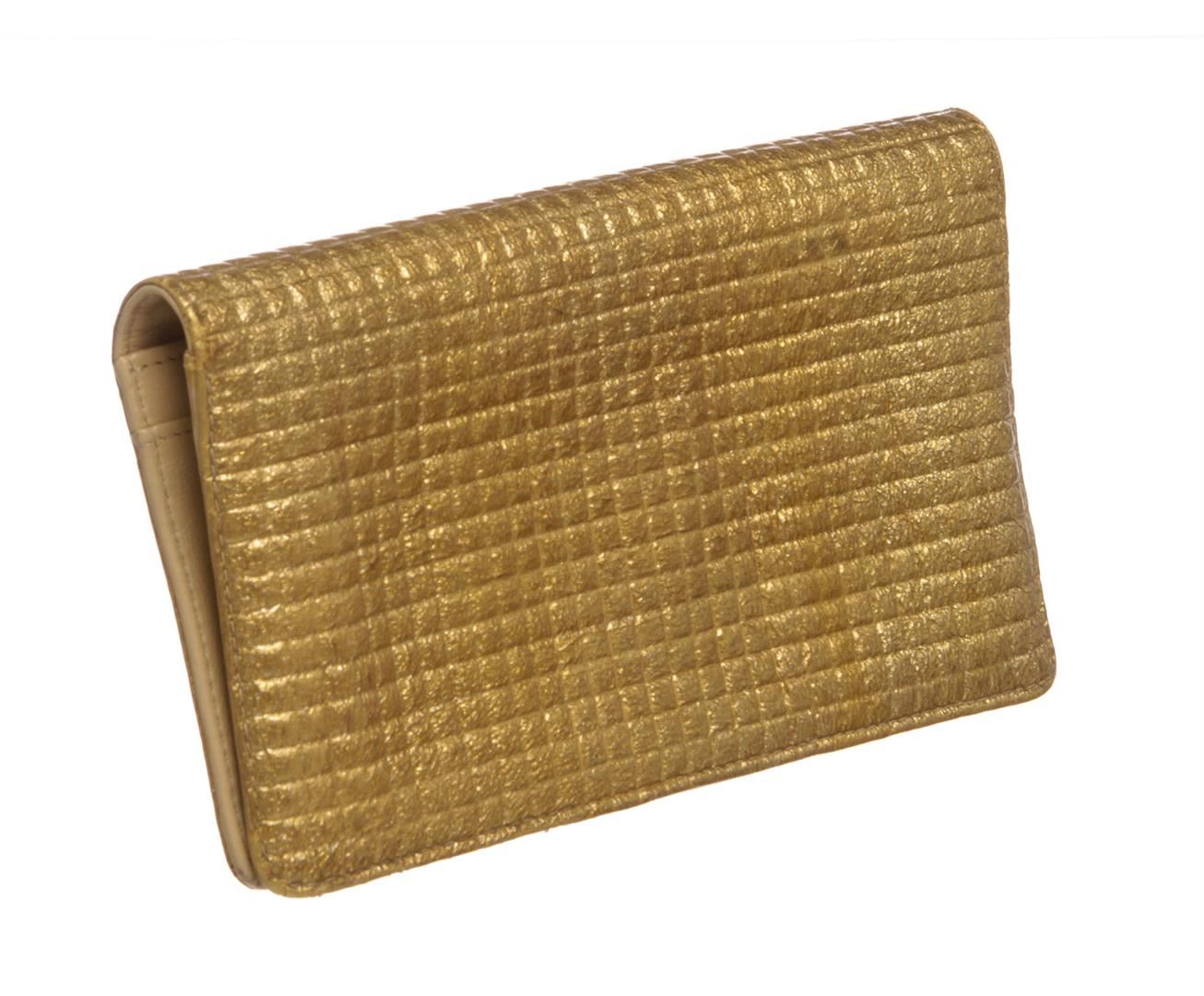 Gold Chanel wallet with silver-tone hardware, tonal leather interior with nude fabric lining, one with zip pull closure, dual bill compartment, eight card slots and fold closure flap. Authentic.