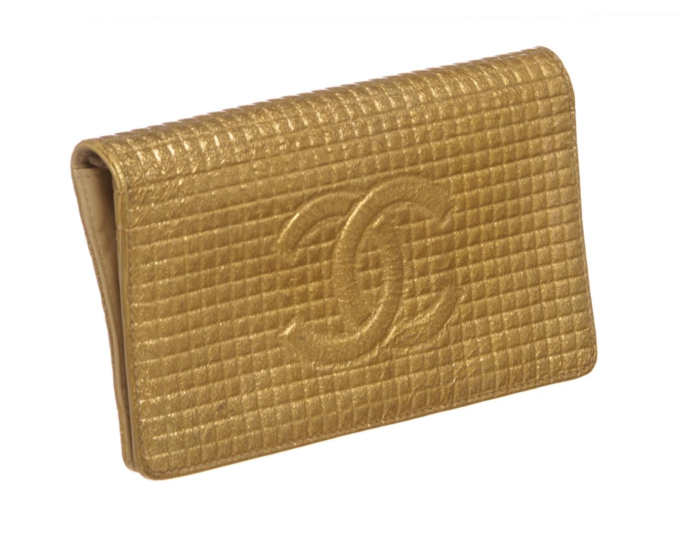 One Chanel Gold Textured Leather CC Flap Bi Fold Wallet. Gold Chanel wallet with silver-tone hardware, tonal leather interior with nude fabric lining, one with zip pull closure, dual bill compartment, eight card slots and fold closure flap.