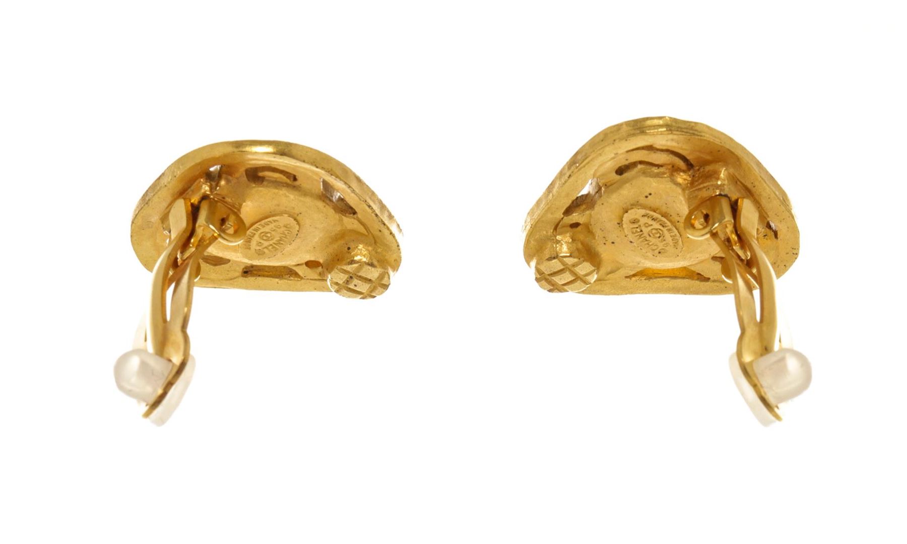 Chanel Gold Triangle Pearl Earrings. All available information is listed in the description and shown in the photos. Chanel Gold Triangle Pearl Earrings with faux pearls, gold tone metal hardware, and made in France.