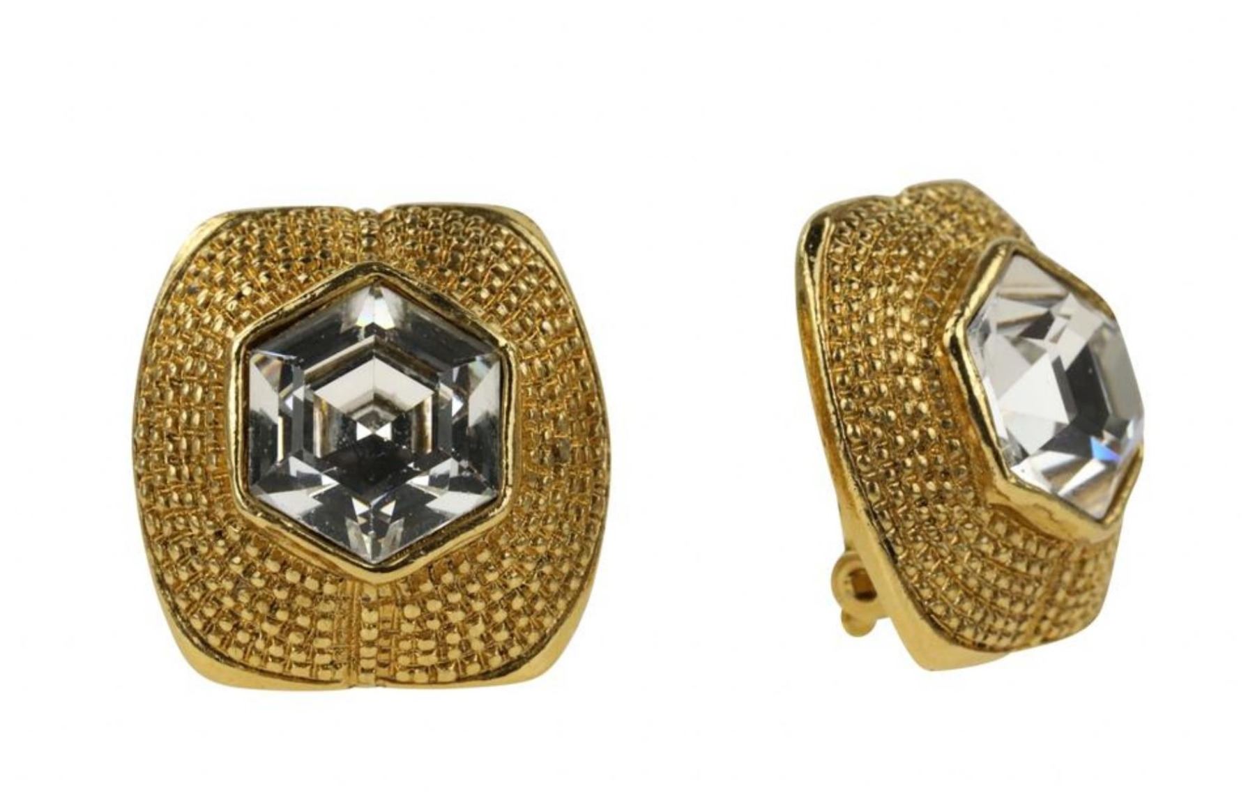 One Chanel Gold Vintage Crystal Clip On Earrings. Chanel Vintage Gold-tone Crystal Clip-on Earrings Clip-on Gold-tone hardware Clear rhinestone center " height ." ." depth Stampings: Chanel CC Made in France