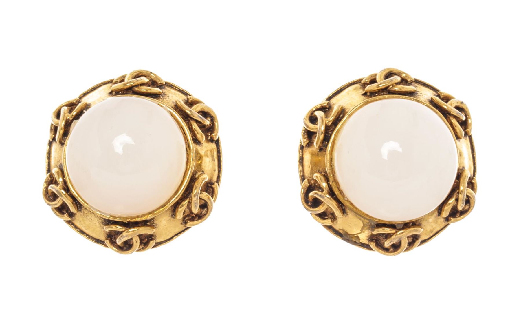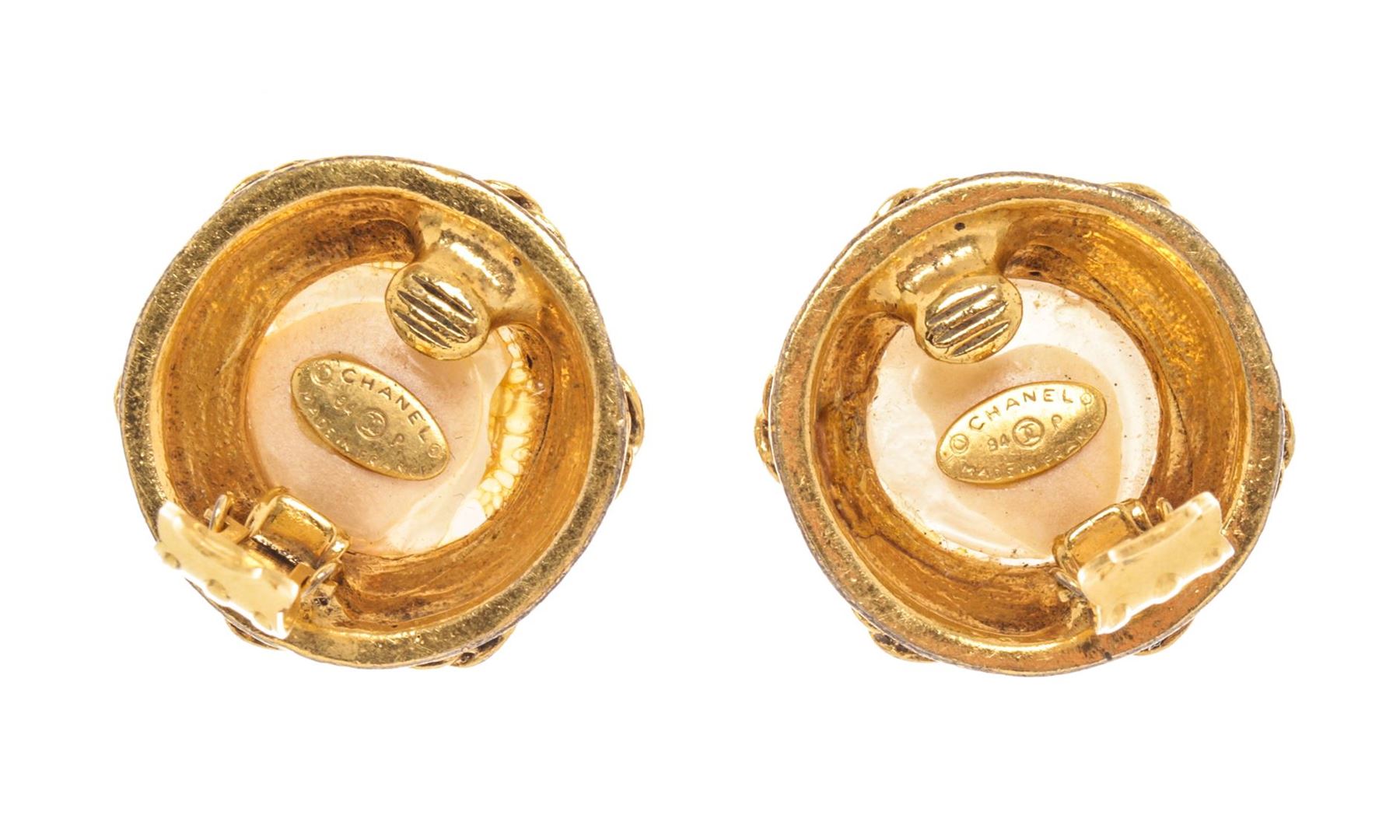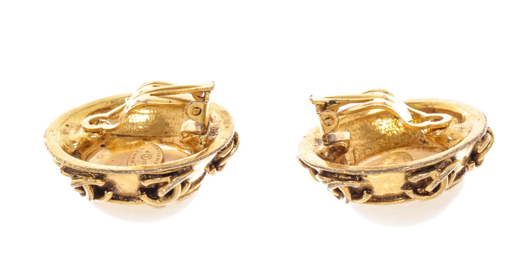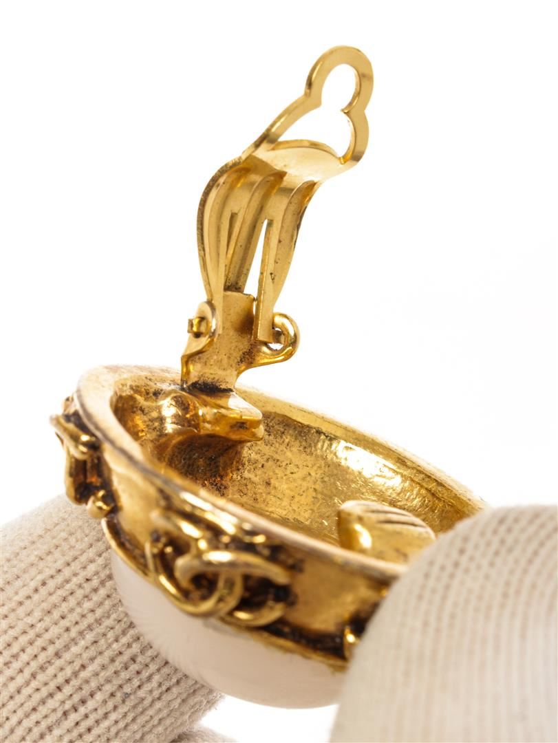 Chanel Gold and Pearl Metal CC Earrings. All available information is listed in the description and shown in the photos. Chanel Gold and Pearl Metal CC Earrings with a big pearl mounted, on the mindle surrounded by the famous double c, gold tone metal hardware with pearls, clip on closure on back.