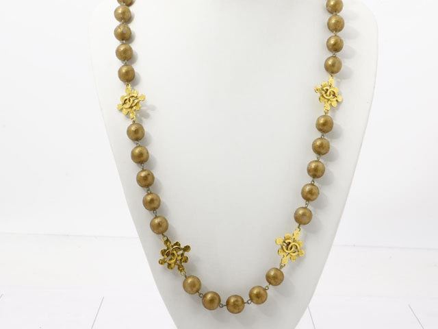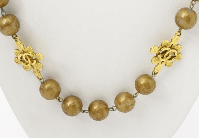 One Chanel Gold-tone Beads CC Logo Necklace. Item is sold AS-IS. All available information is listed in the description and shown in the photo. Chanel Gold-tone Beads CC Logo Necklace is crafted from gold-tone metal and styled with gold-colored beads. It also carries the iconic CC logo charm with classic background shape and fastens with the help of a spring closure.