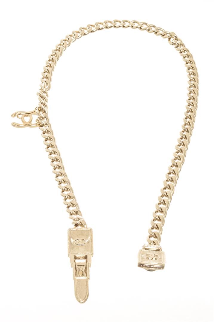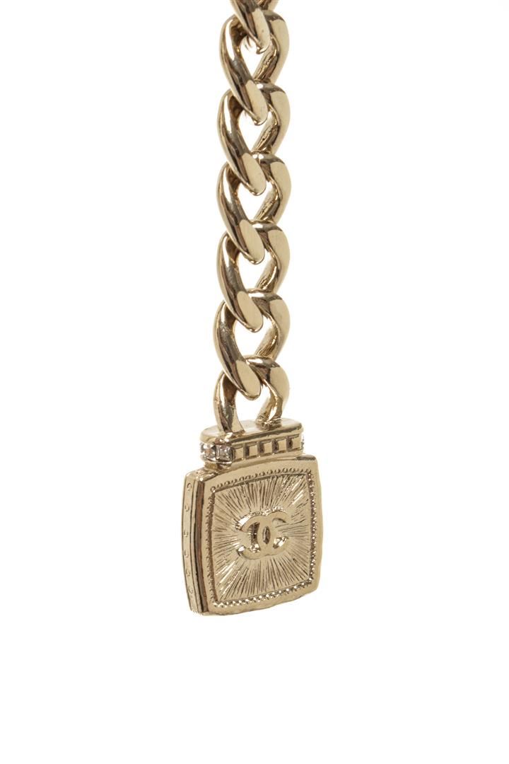 One Chanel Gold-tone CC Lipstick Chain. Item is sold AS-IS. All available information is listed in the description and shown in the photo. Chanel gold-tone CC lipstick chain with a lipstick charm with a CC logo and rhinestones on it on one end, a rhinestone CC logo in a square on the other end, and a CC rhinestone logo in the middle.