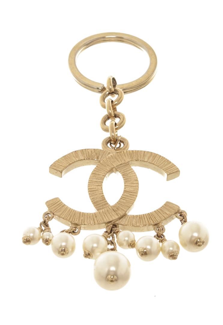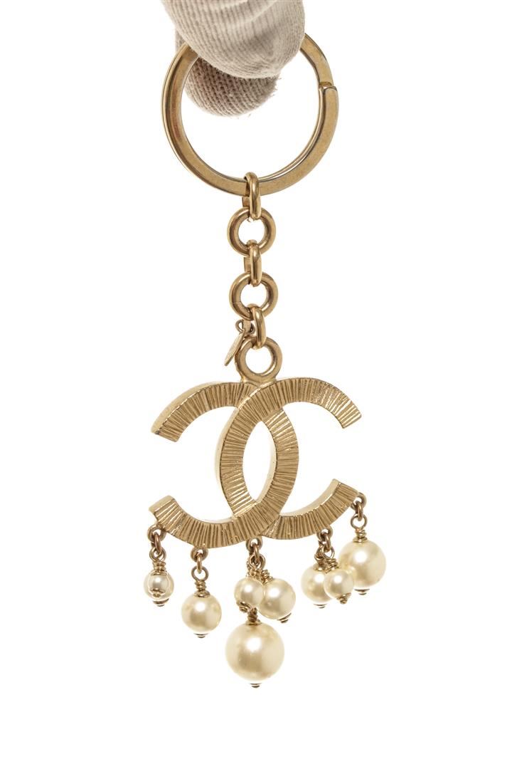 Chanel Gold-tone CC Logo Pearl Key Chain. All available information is listed in the description and shown in the photos. Chanel Gold-tone CC Logo Pearl Key Chain with chanel cc key chain is crafted in light gold-tone hardware and features interlocking cc etched logo with beautiful white faux pearls of various sizes.