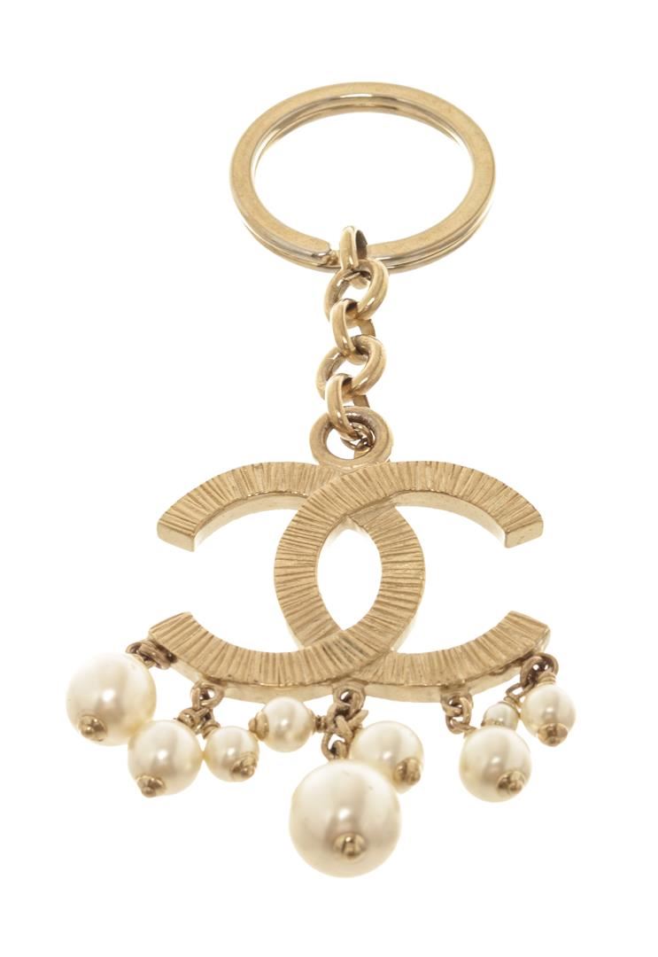 Chanel Gold-tone CC Logo Pearl Key Chain. All available information is listed in the description and shown in the photos. Chanel Gold-tone CC Logo Pearl Key Chain with chanel cc key chain is crafted in light gold-tone hardware and features interlocking cc etched logo with beautiful white faux pearls of various sizes.