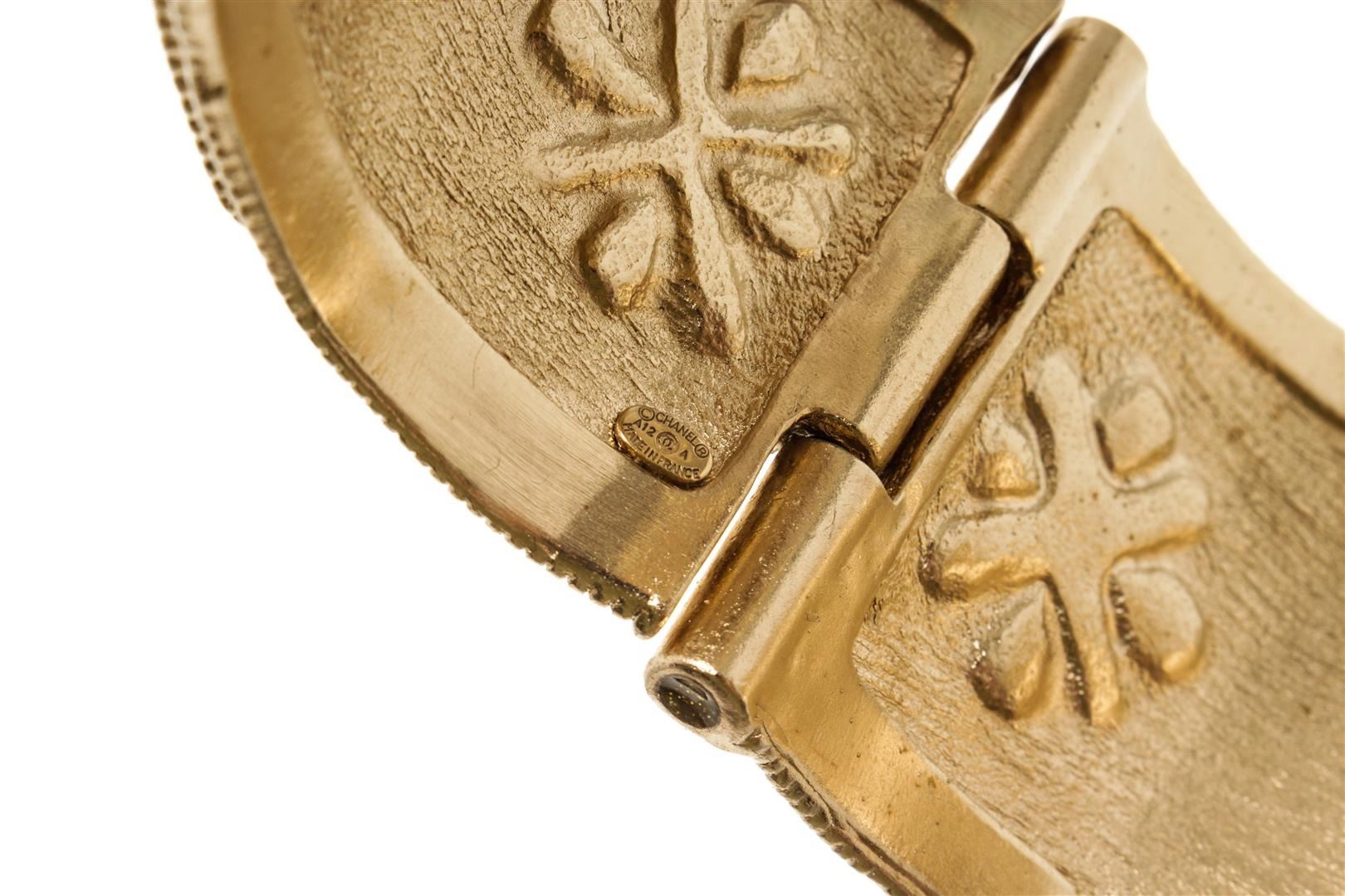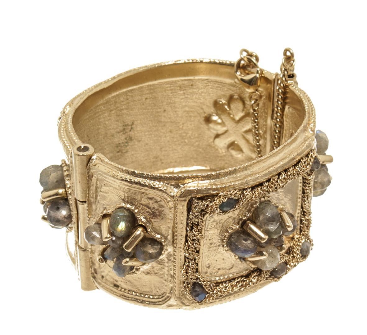 One Chanel Gold-tone Calfskin & Labradorite CC Wide Cuff Bangle. Item is sold AS-IS. All available information is listed in the description and shown in the photo. Chanel Gold-tone Calfskin & Labradorite CC Wide Cuff Bangle