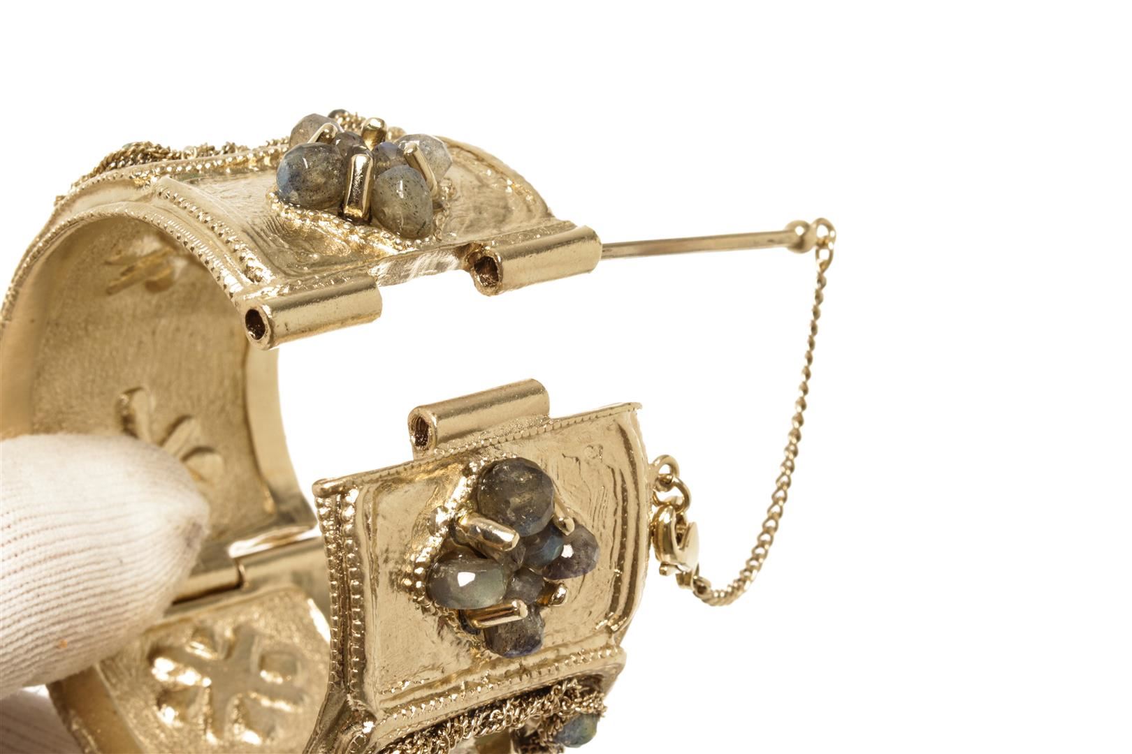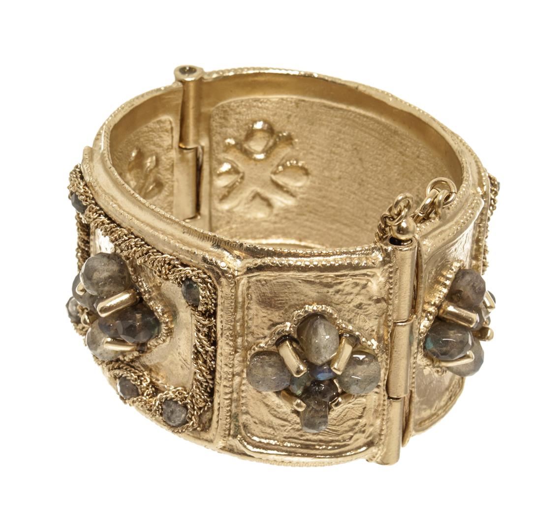One Chanel Gold-tone Calfskin & Labradorite CC Wide Cuff Bangle. Item is sold AS-IS. All available information is listed in the description and shown in the photo. Chanel Gold-tone Calfskin & Labradorite CC Wide Cuff Bangle