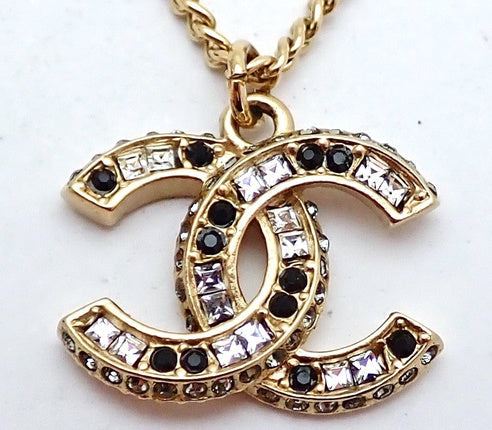One Chanel Gold-tone Chain CC Rhinestone Pendant Necklace. Item is sold AS-IS. All available information is listed in the description and shown in the photo. Chanel CC necklace features gold-tone chain, interlocking CC logo pendant embellished with clear and black rhinestones, a small interlocking CC logo charm and a lobster claw closure.