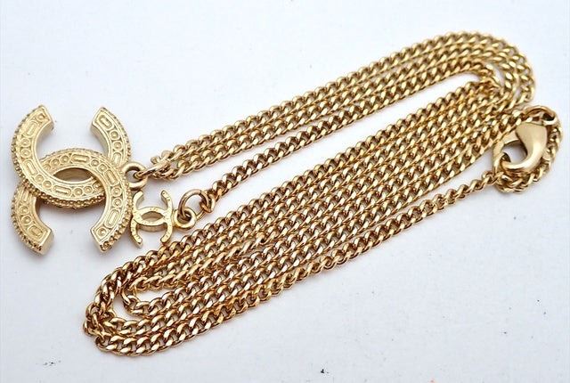 One Chanel Gold-tone Chain CC Rhinestone Pendant Necklace. Item is sold AS-IS. All available information is listed in the description and shown in the photo. Chanel CC necklace features gold-tone chain, interlocking CC logo pendant embellished with clear and black rhinestones, a small interlocking CC logo charm and a lobster claw closure.