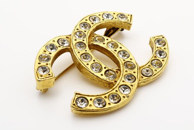 Chanel Coco Mark CC Brooch features a large gold Chanel interlocking CC logo lined with beautiful crystals.