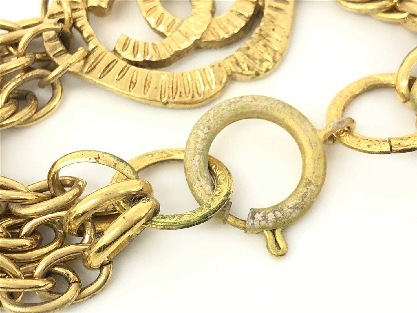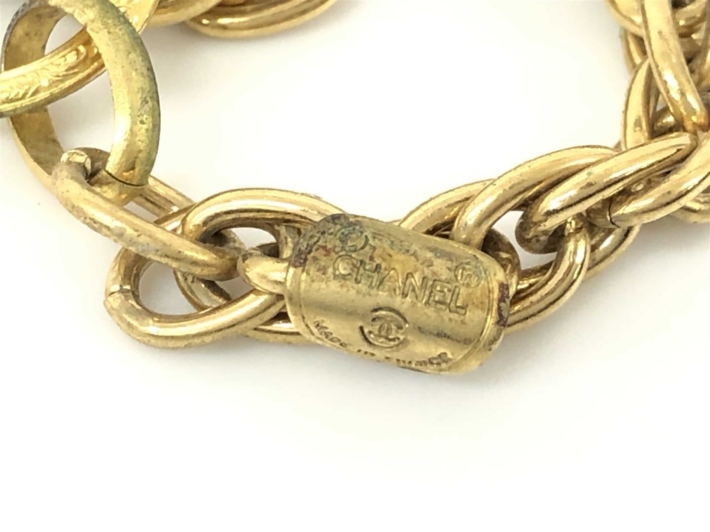 One Chanel Gold-tone Metal CC Logo Charm Multi-chain Bracelet. Item is sold AS-IS. All available information is listed in the description and shown in the photo. This Chanel CC Logo Charm Multi-Chain Bracelet is made of gold-tone hardware. The bracelet has a bold Chanel statement logo and a three double chain. It closes with a spring-ring closure.