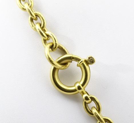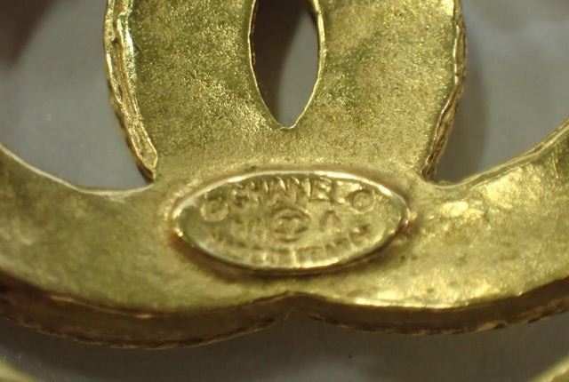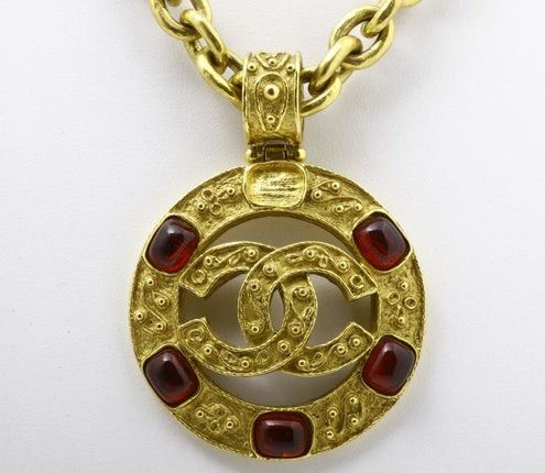 Chanel Vintage Gripoix necklace features gold-tone hardware, a pendant with round interlocking CC cutout logo at center embellished with red-colored stones and a spring ring closure.