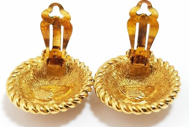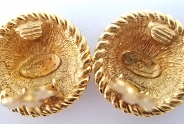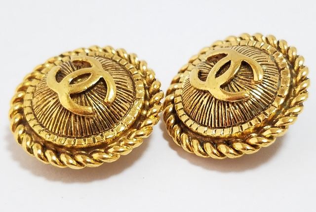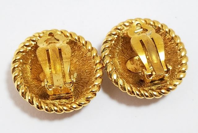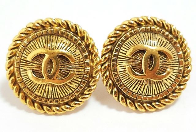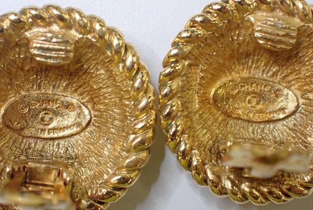 Chanel CC earrings feature gold-tone metal, interlocking CC logo at front with sunburst/etched background and clip-on closures.
