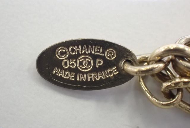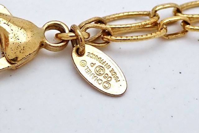 Chanel CC Gripoix necklace features gold-tone metal hardware, an interlocking CC logo adorned with clear rhinestones and surrounded by multicolor lab-created stones, faux white pearl embellishment on chain and lobster clasp closure.