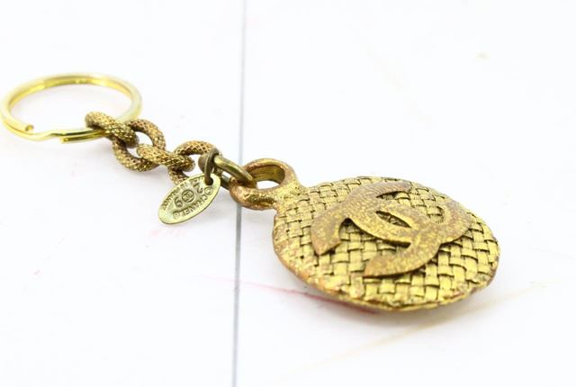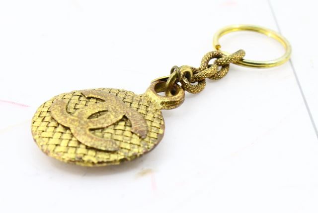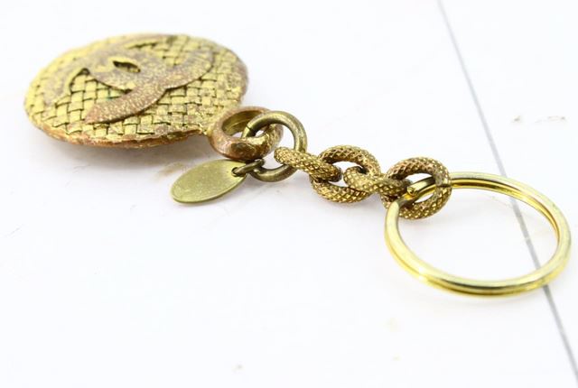Chanel keyholder features gold-tone hardware, a round charm with interlocking CC logo at center and woven background and O-ring closure.