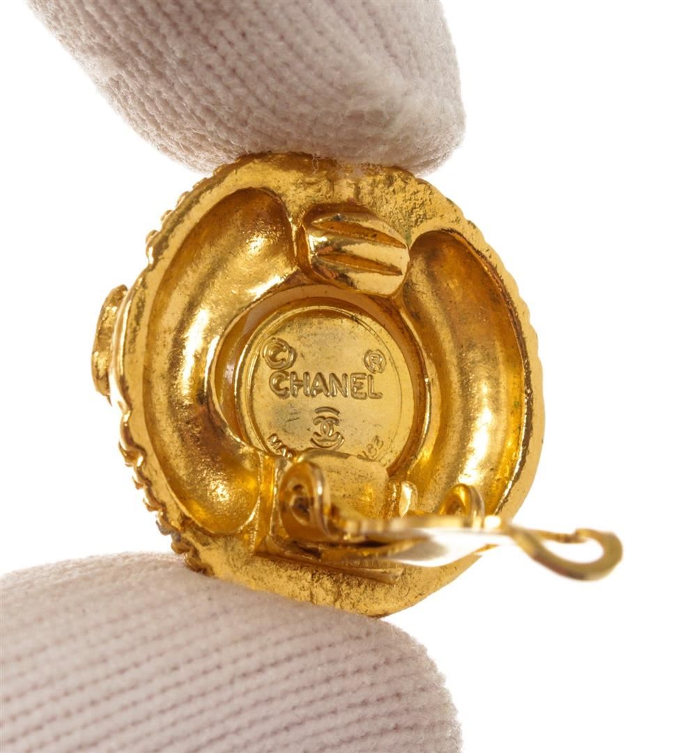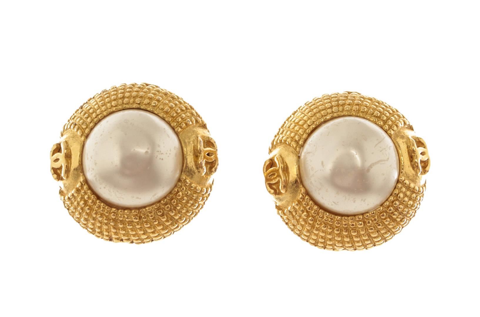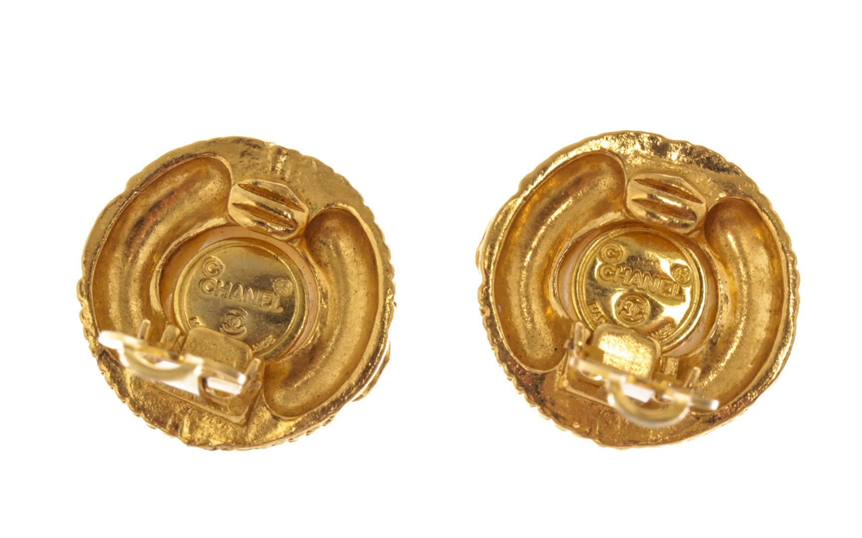 One Chanel Gold-tone Round Pearl Clip-on Earrings. Item is sold AS-IS. All available information is listed in the description and shown in the photo. Chanel Gold-tone Round Pearl Earrings feature pearl at the center, interlocking CC logo, etched accent and gold-tone hardware.