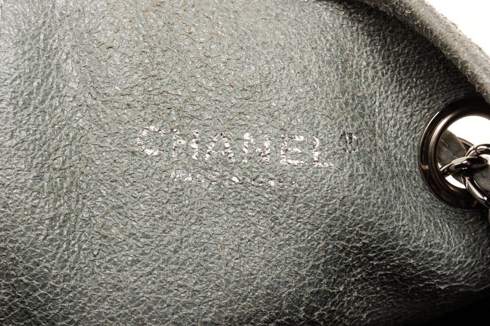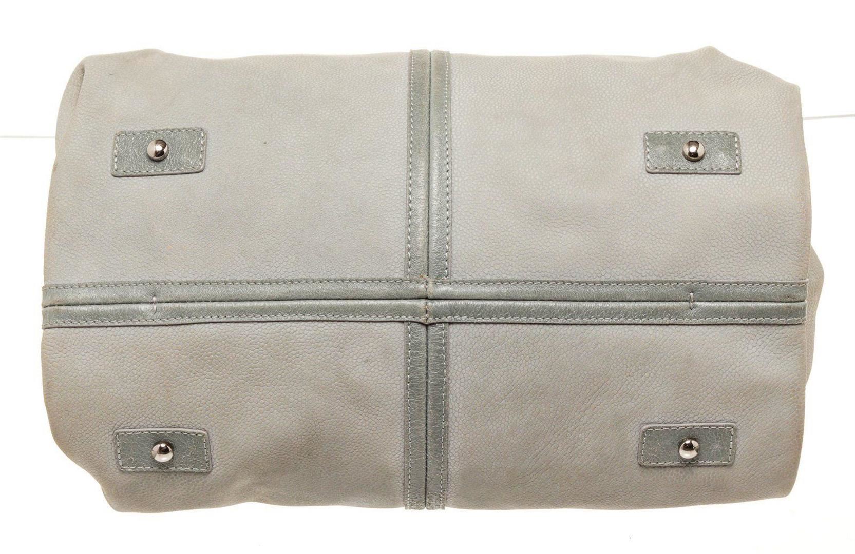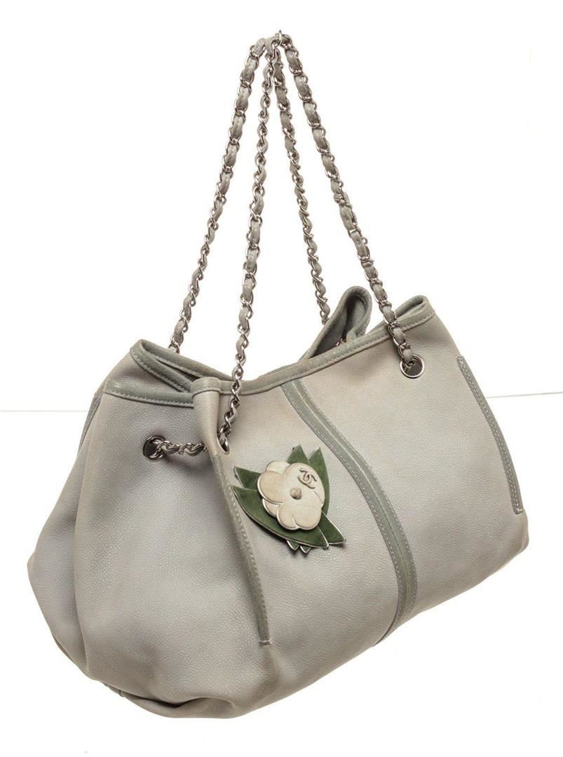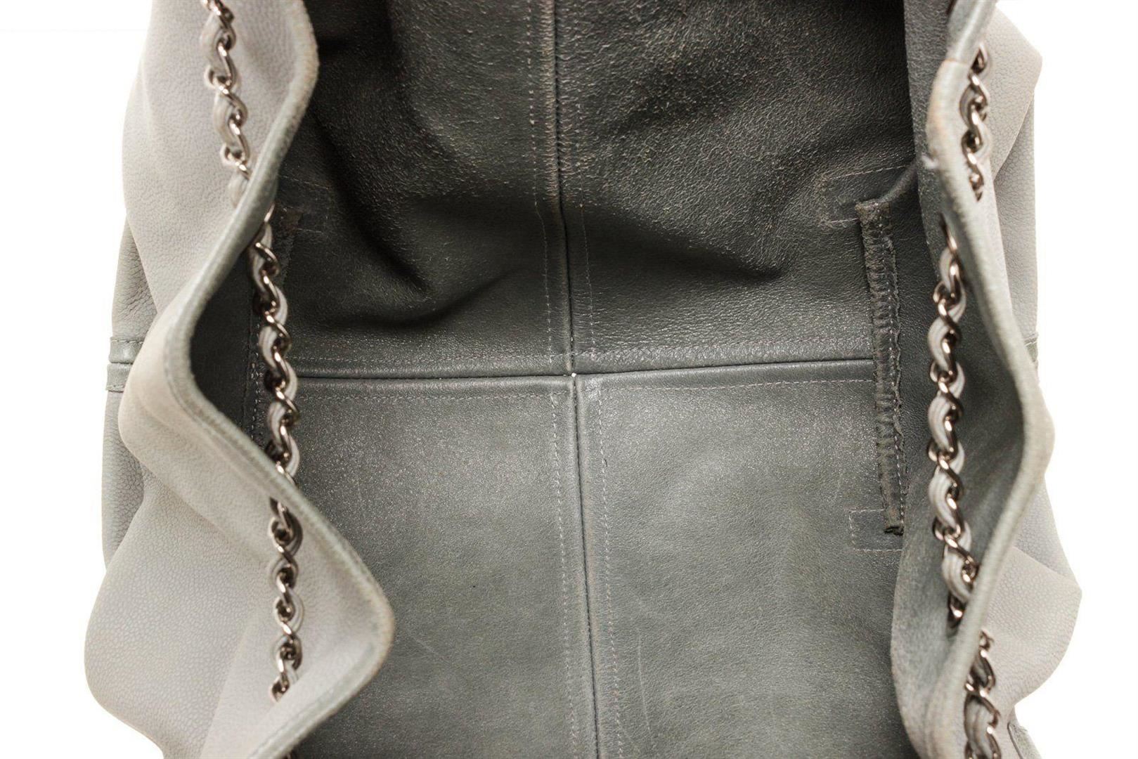Chanel Gray Leather Drawstring Bucket Bag with material leather gold-tone hardware, interior slip pocket, chain shoulder strap and drawstring closure.