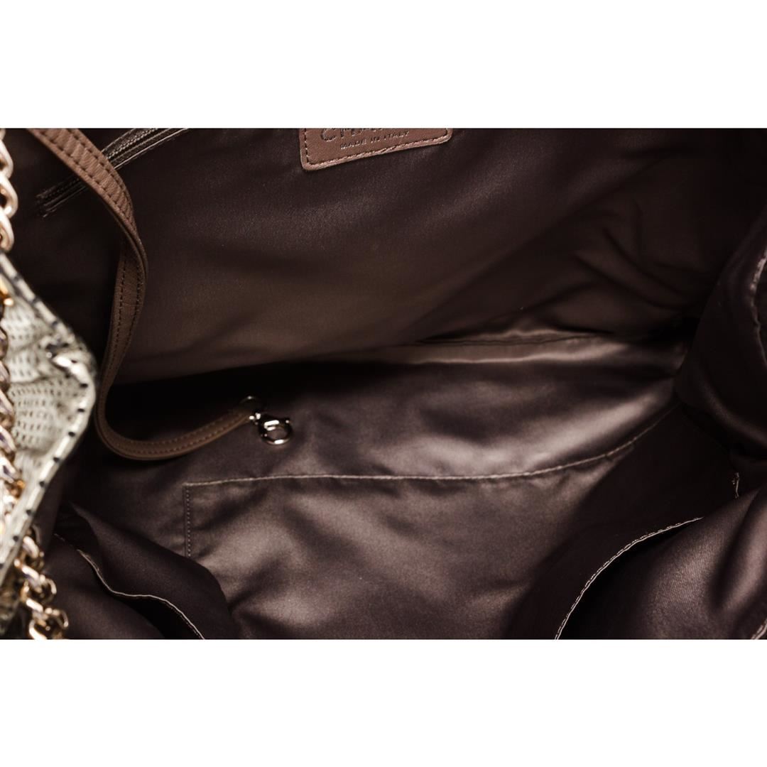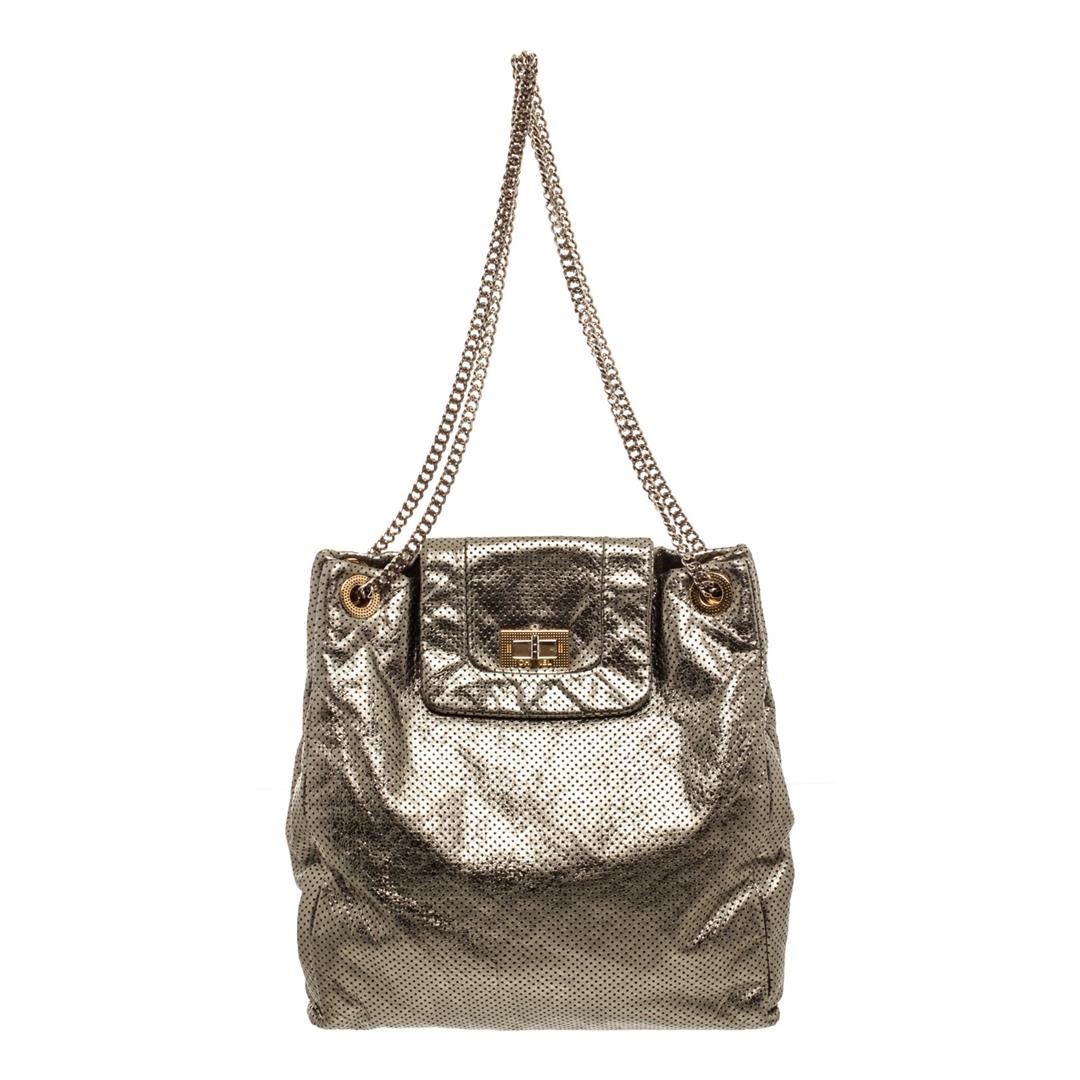 Crafted out of gray cracked perforated calfskin leather. silver-tone hardware, and turn lock closure at flap. Authentic.