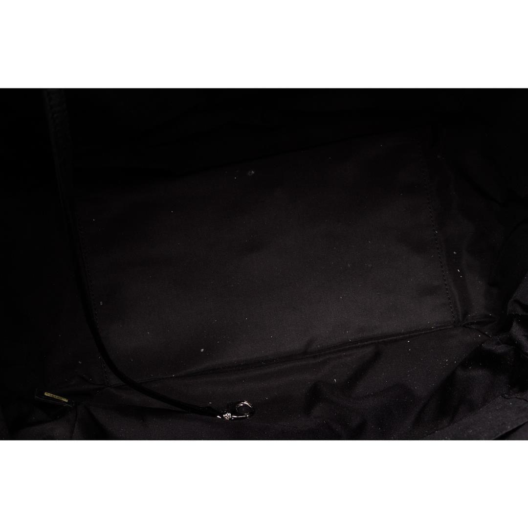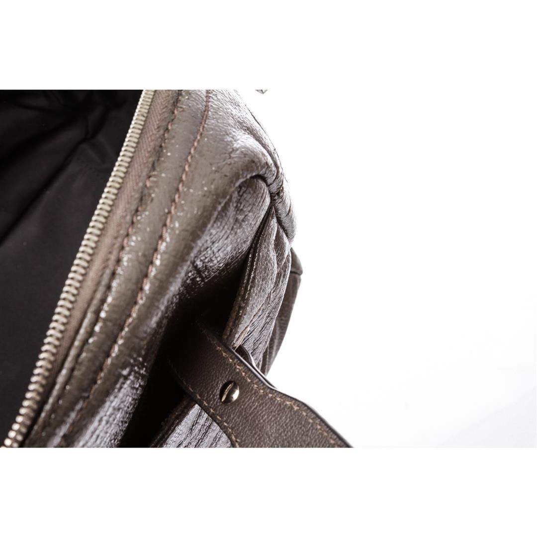 Crafted out of gray vinyl, double flat handles, silver tone hardware, and zip top closure. Outer side slip pocket. Inner black fabric lining, side zip pocket, and dual slip pockets. Authentic.